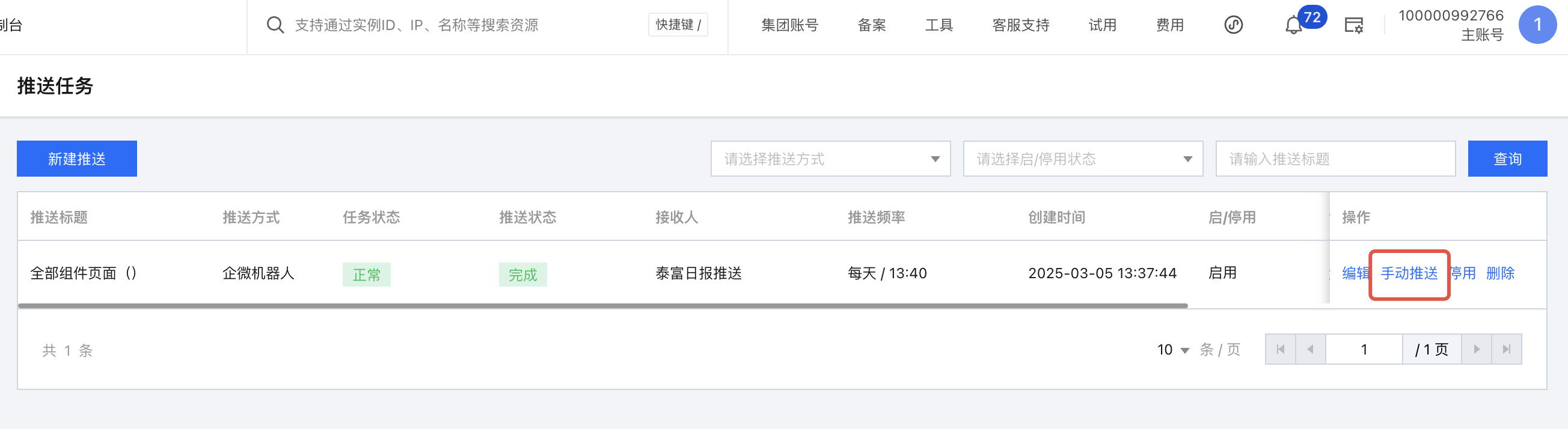 1. 在列表中,选择手动推送,则可以发起一次推送,内容和推送对象和定时推送一致: