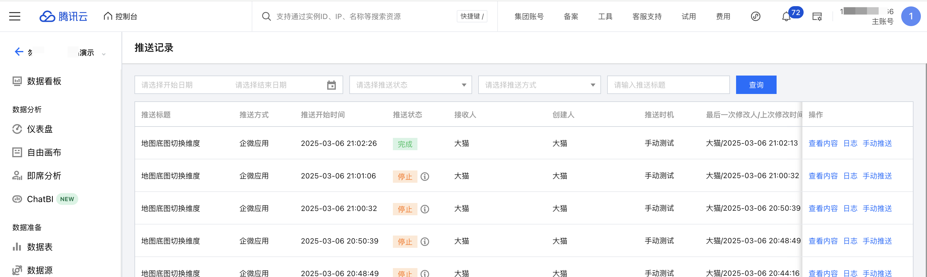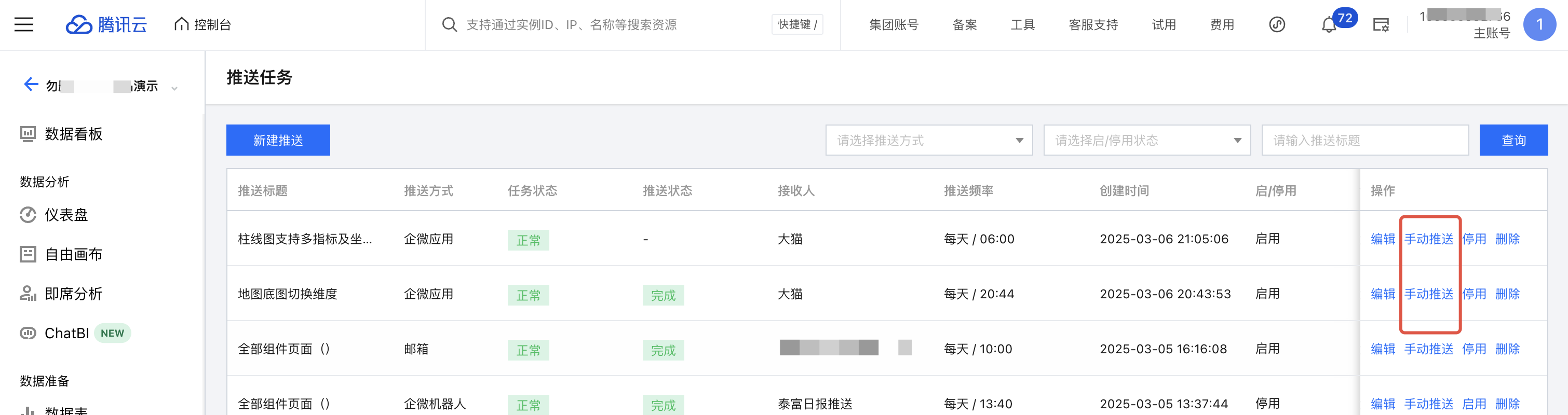 1. 在列表中,选择手动推送,则可以发起一次推送,内容和推送对象和定时推送一致: