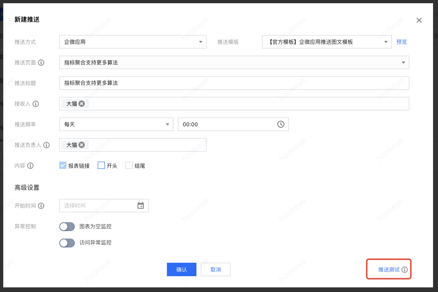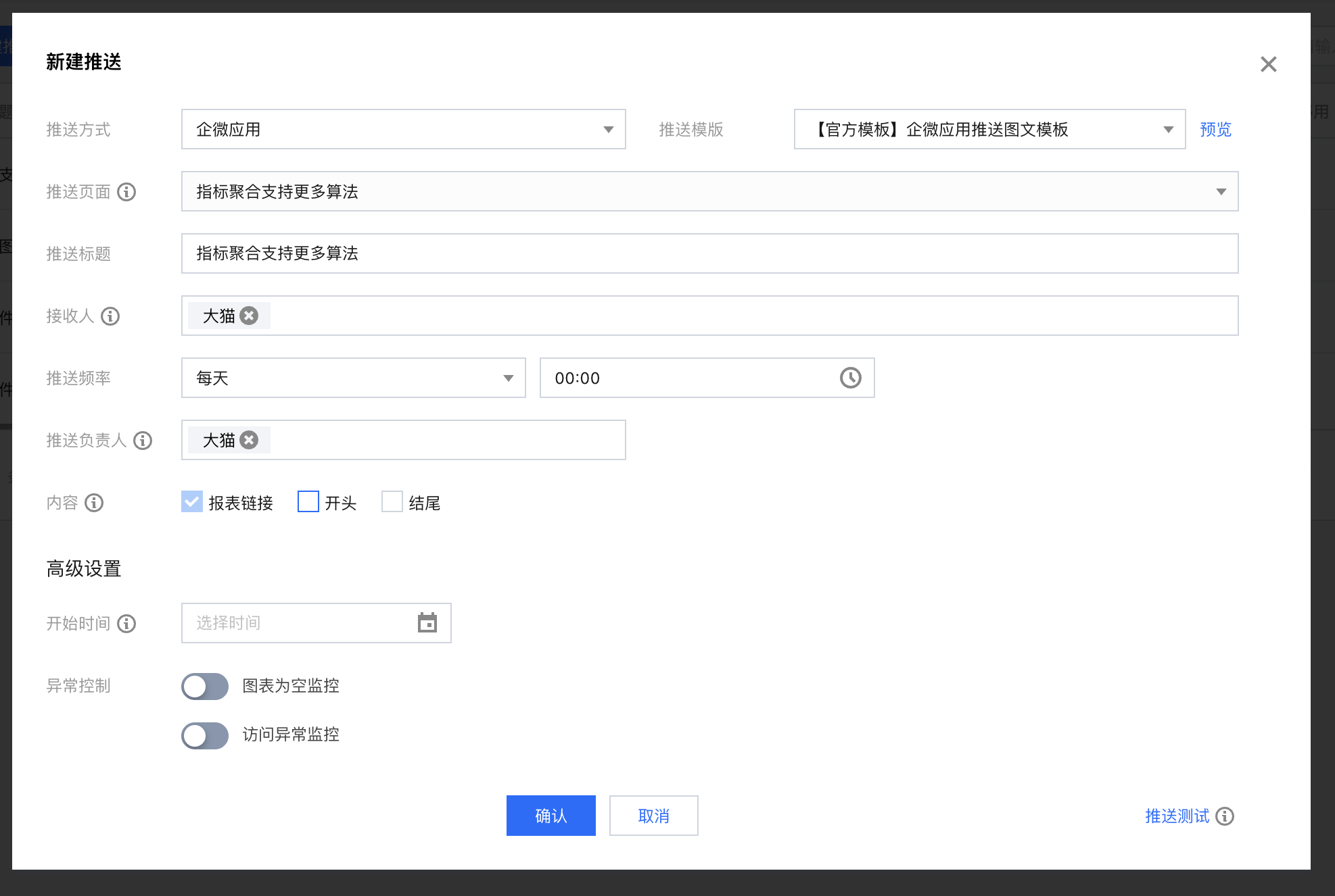 高级设置-异常控制-访问异常监控 | 设置图表访问报错时的处理方式,包含以下可配置项: 1. 异常范围:包含全部图表异常和部分图表异常 2. 出现异常的处理:可选暂停当次推送(取消勾选会忽略异常,直接推送) 及 发送告警(勾选后为空时会发送告警给通知机器人) | 可同时选择 告警 和 暂停推送 |