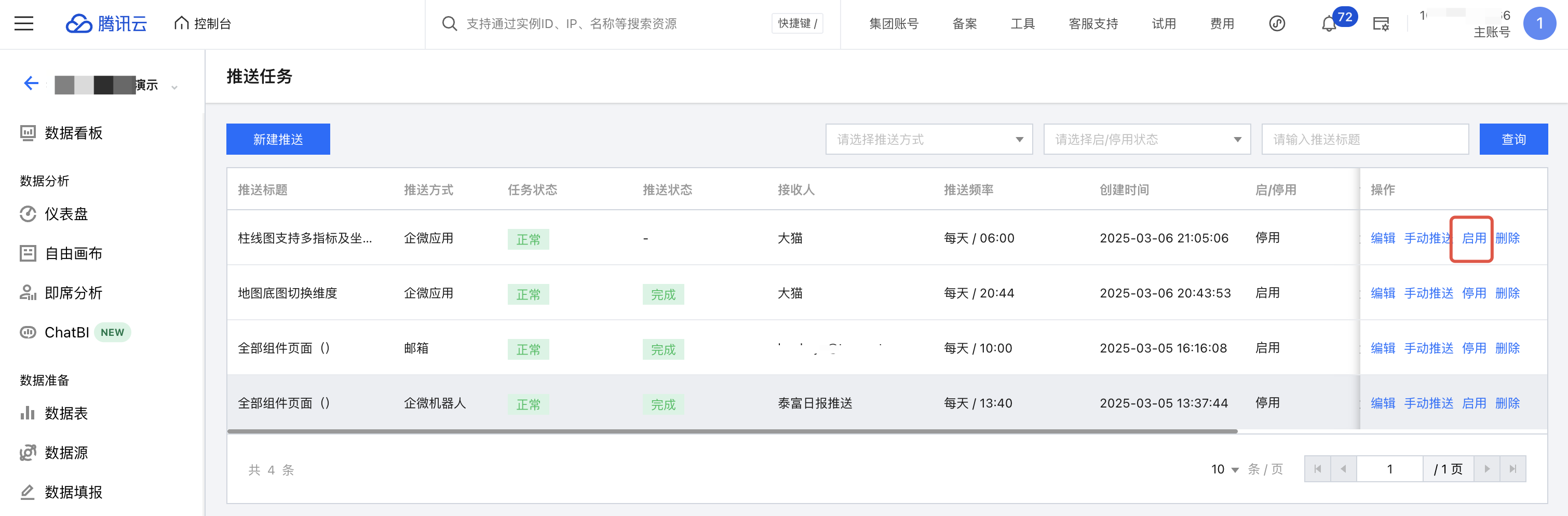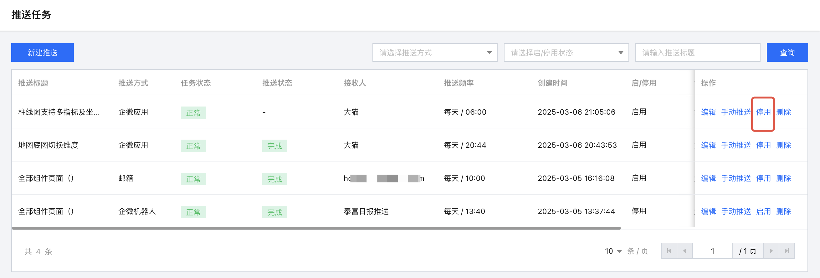 在某些情况下,需要暂时停用任务,不推送;待调整完后,又需要重新启用任务,继续推送。通过以下步骤可对任务灵活管理: