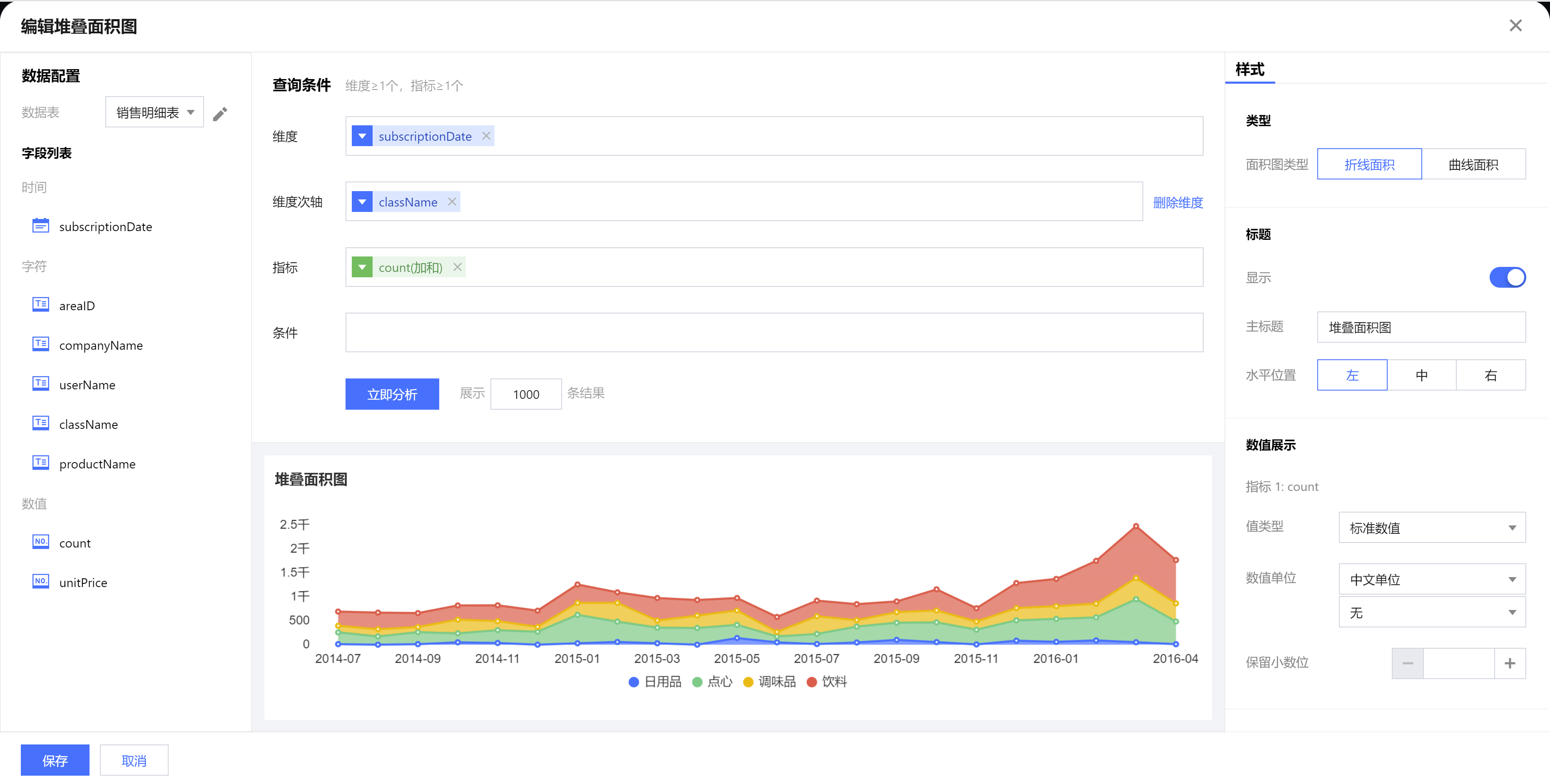 面积图类型 | 折线面积/曲线面积 | 可设置堆积面积图的类型为折线面积图或者曲线面积图 |