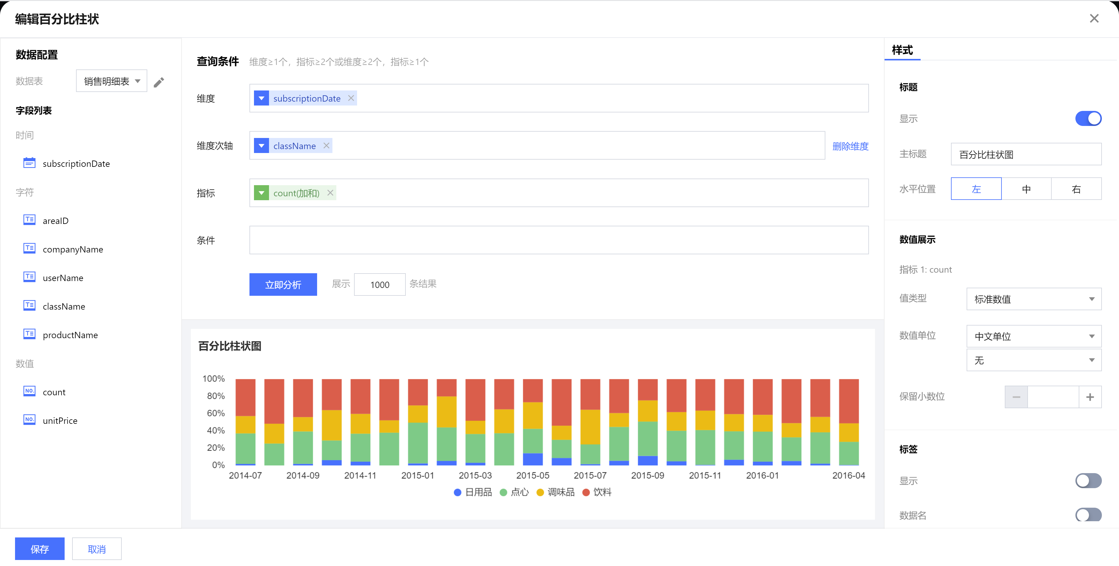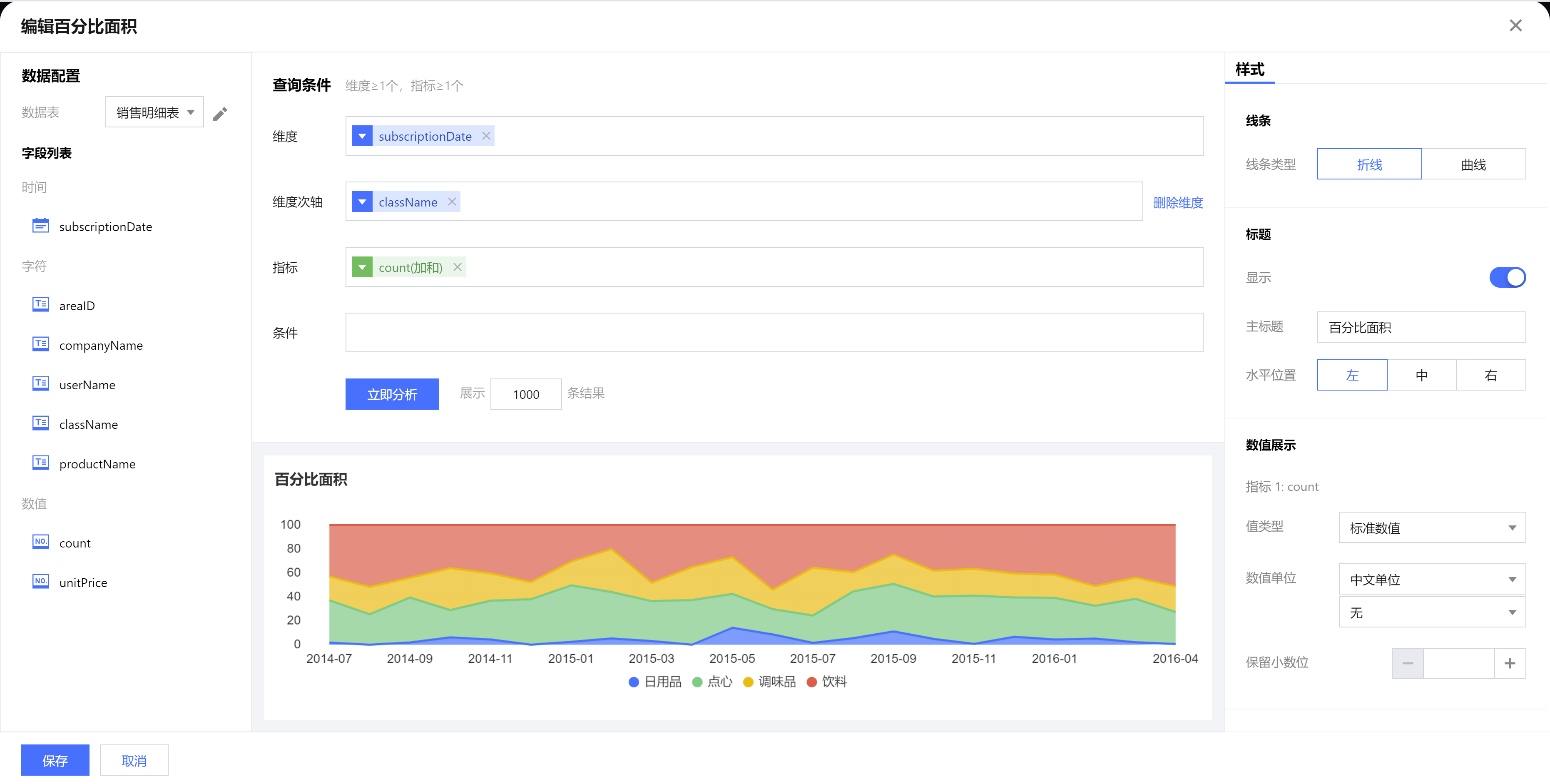 面积图类型 | 折线面积/曲线面积 | 可设置百分比面积图的类型为折线图或者曲线图 |