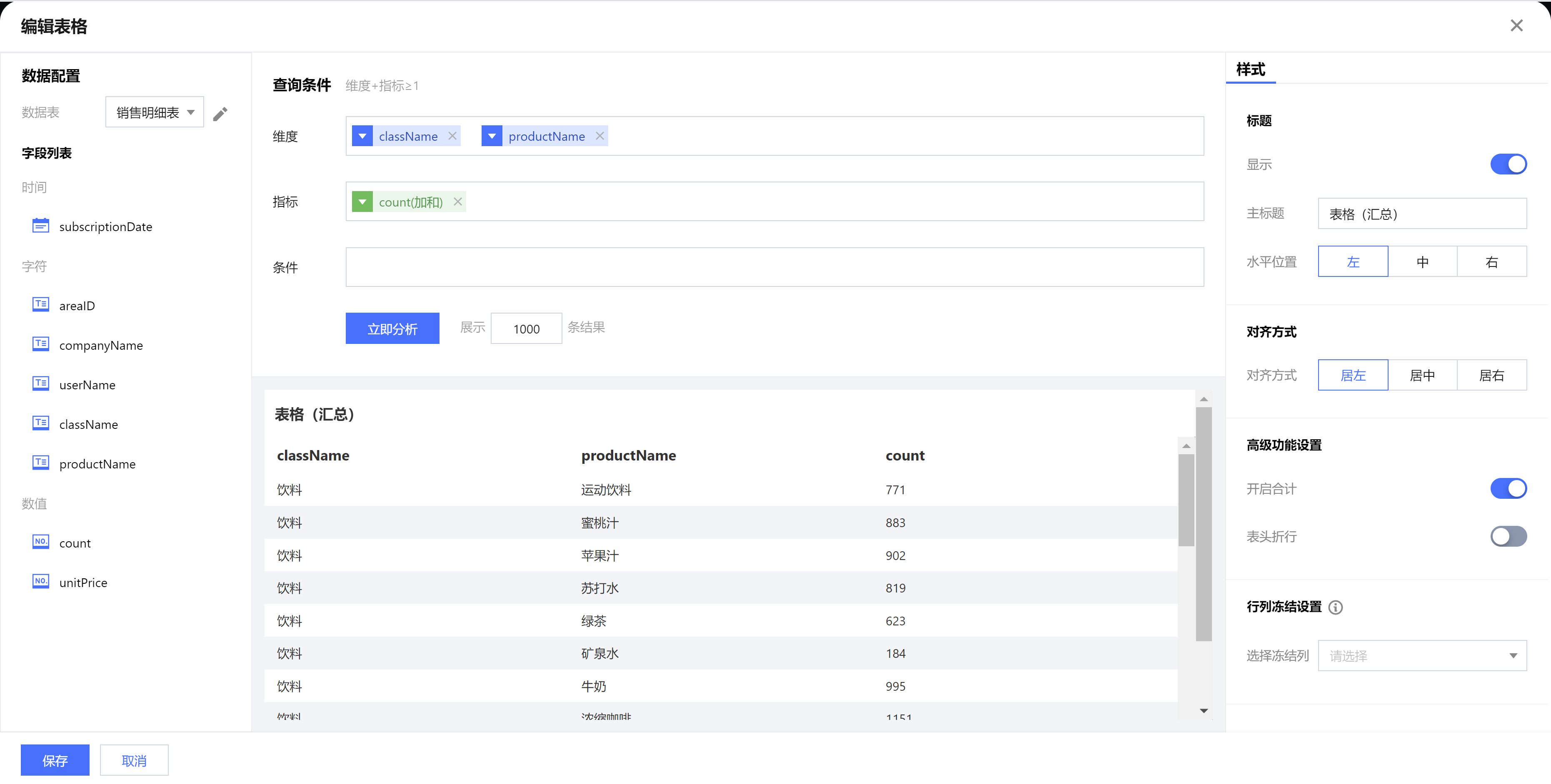 对齐方式 | 居左/居中/居右 | 设置表格中的文字对齐方向,可选择居左/居中/居右 |