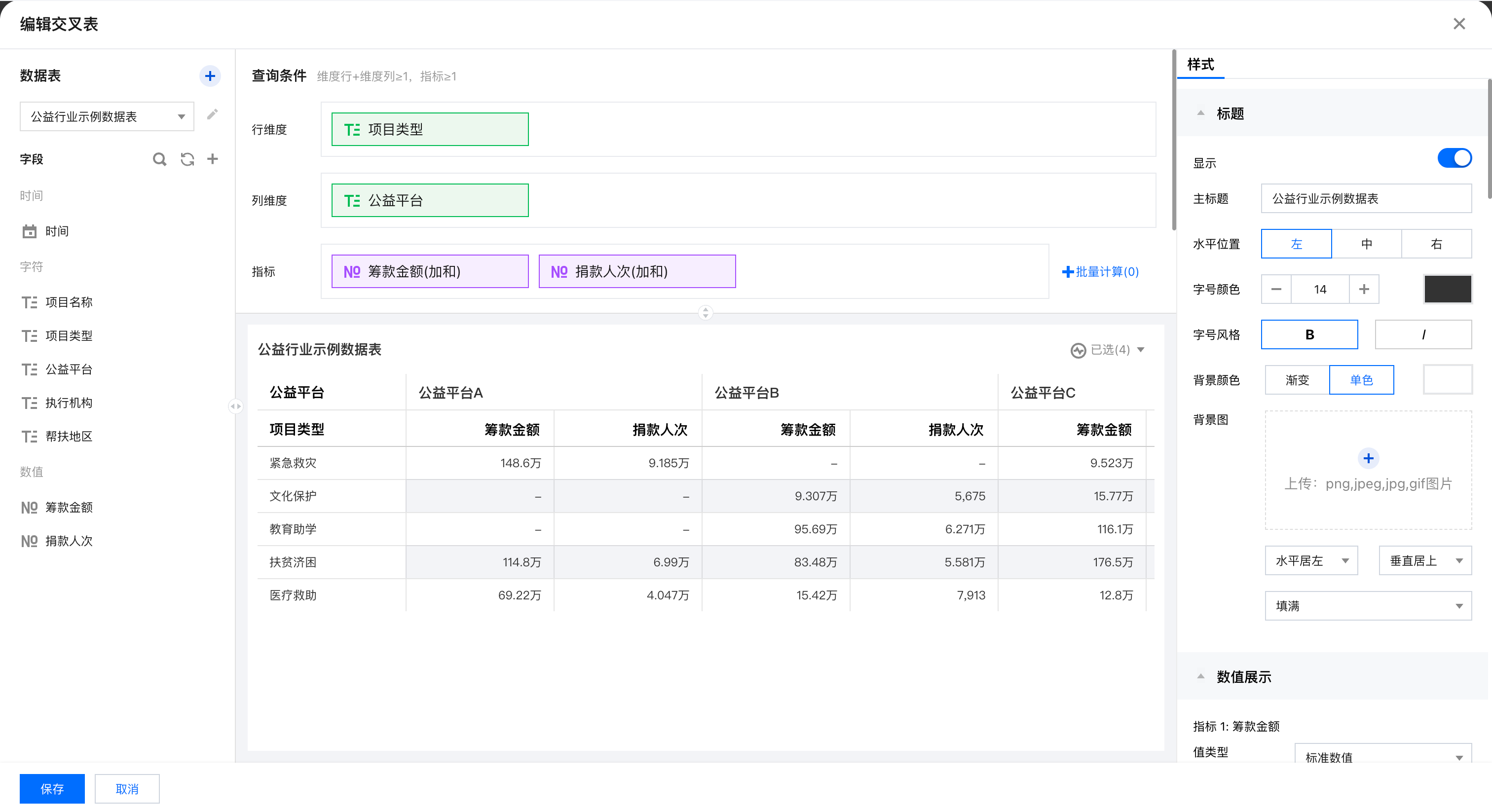 | 数值单位 | 设置数值展示的单位,提供以下单位供选择:1.无2.万:如“121112”,展示为12.111万,以下单位类推3.百万4.千万5.亿6.十亿7.百亿 |