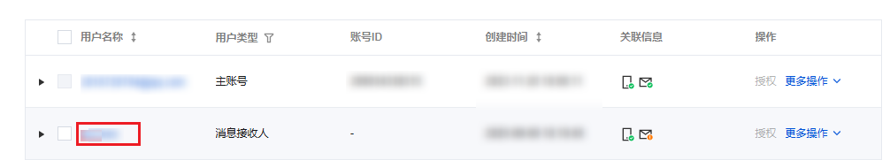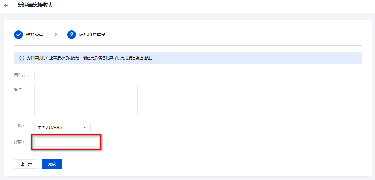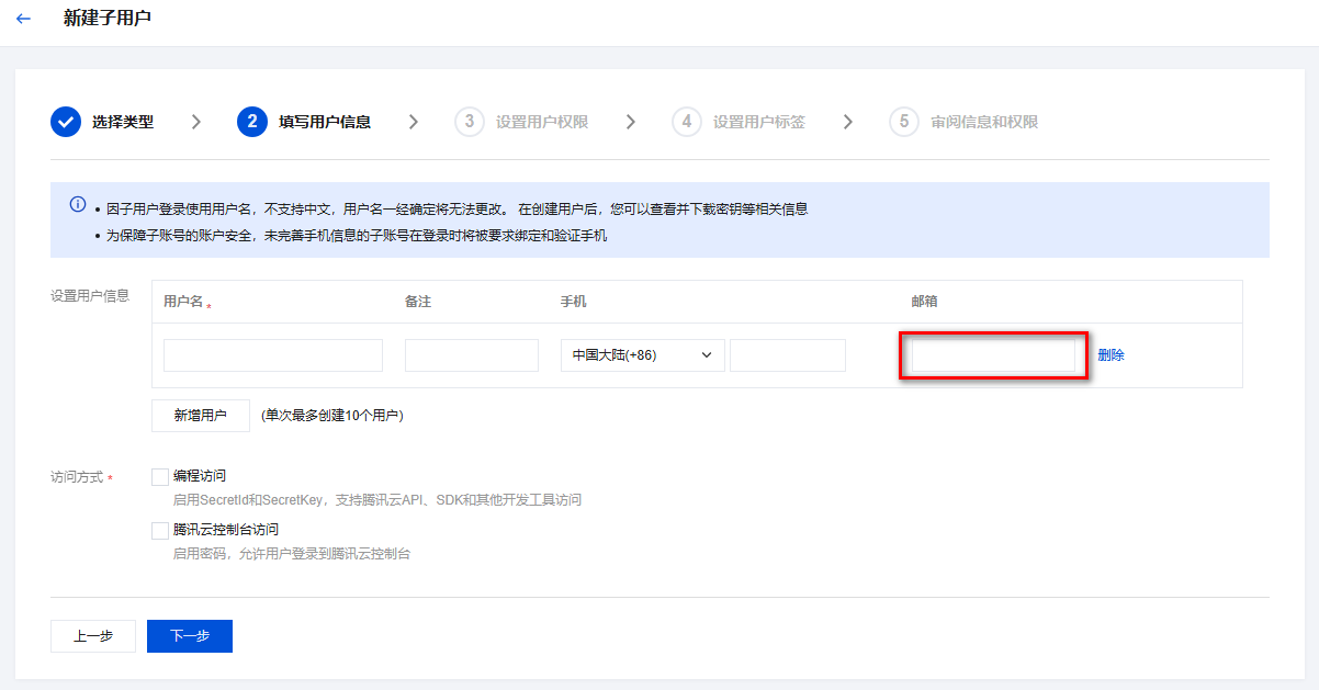 4. 在选择类型页面,按需选择需要创建的用户类型后,进入填写用户信息页面,填写用户信息以及后续步骤,请参见 新建子用户。 可访问资源并接收消息:在邮箱处填入允许接收消息的邮箱后,您的邮箱将会收到一封邮箱接收消息验证的邮件,单击确认接收。