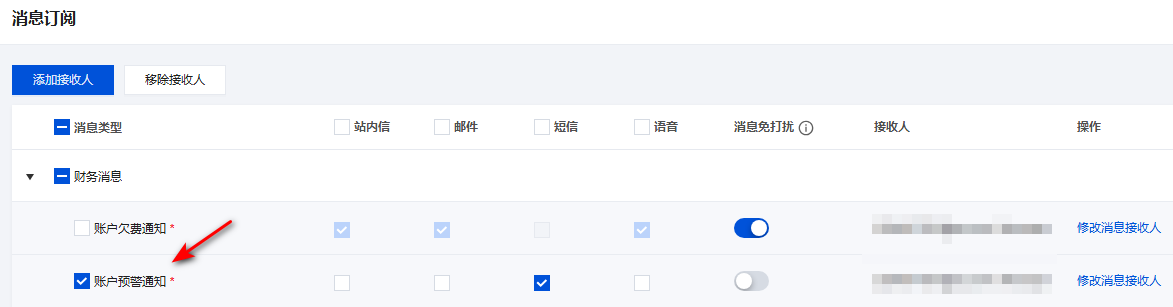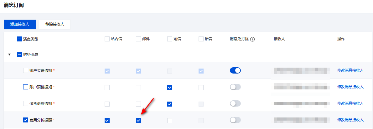 1. 在消息中心 > 消息订阅 页面,找到您需要使用邮箱接收消息的消息类型,勾选对应消息类型。 2. 然后勾选邮件渠道即可完成。