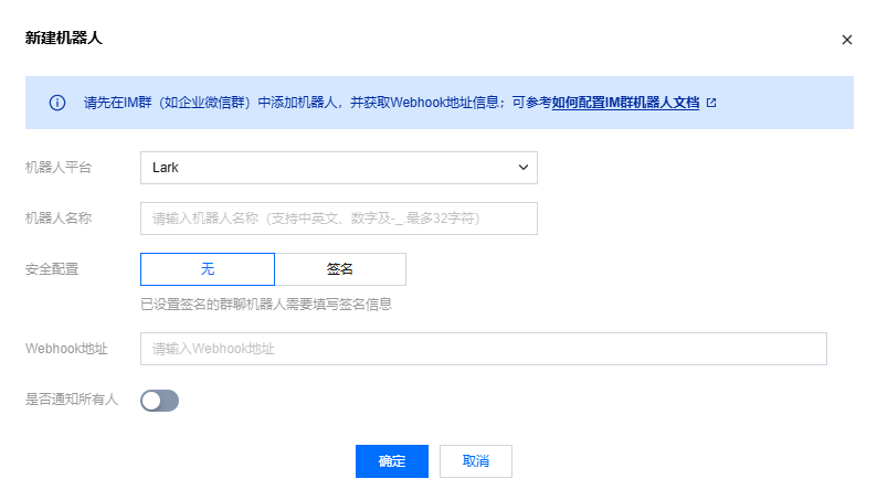 3. 在新建机器人窗口,填写以下配置信息。
