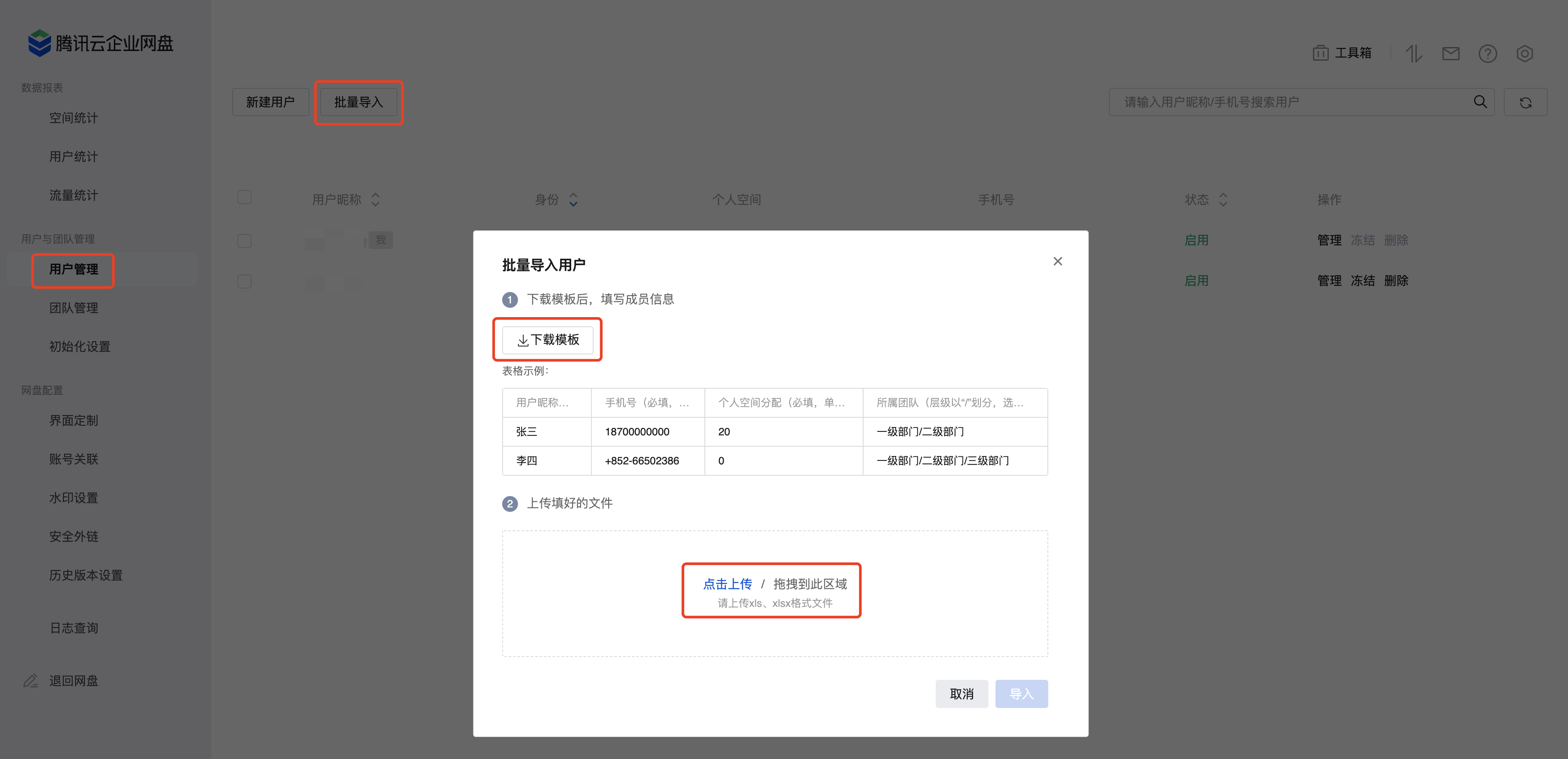 批量导入:单击批量导入 > 下载模板,打开下载的表格,填写用户昵称、手机号、个人空间分配、所属团队等信息,上传表格,单击导入,即可完成用户导入和团队创建。 4. 添加成功后,用户可以通过手机号登录企业网盘进行操作。