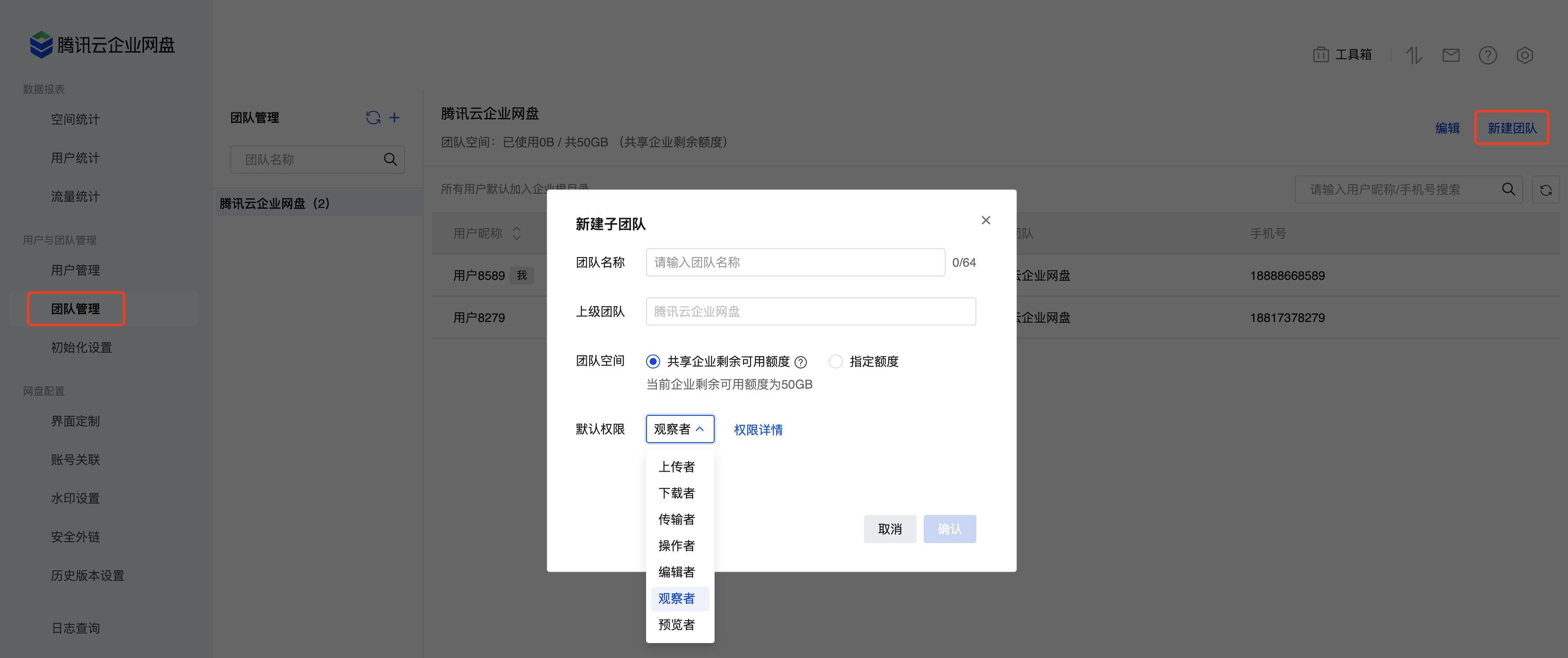 团队空间:指该团队的存储空间额度;需小于剩余可分配额度。