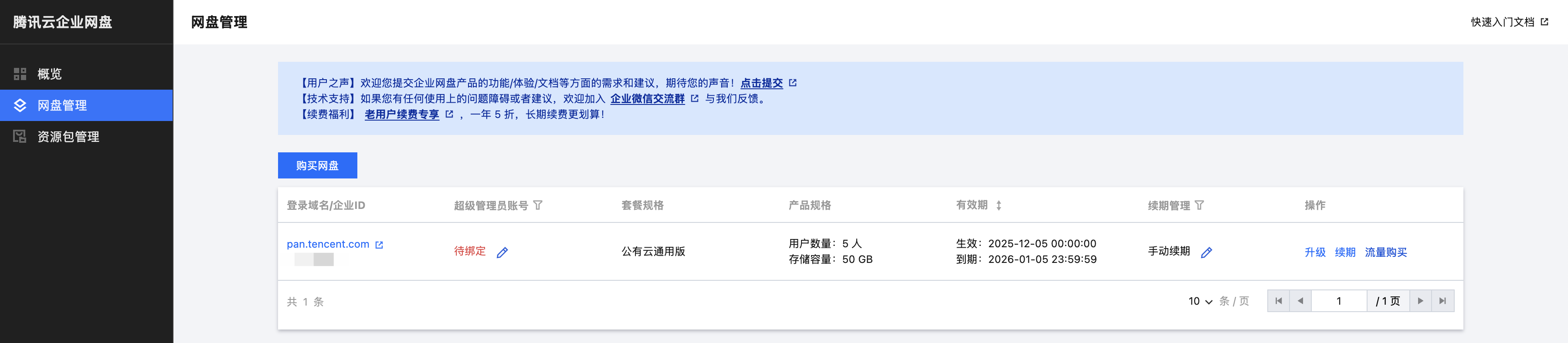 2. 单击超级管理员账号列的待绑定右侧图标,输入超级管理员手机号并验证通过。 3. 单击企业网盘登录域名,进入登录界面。
