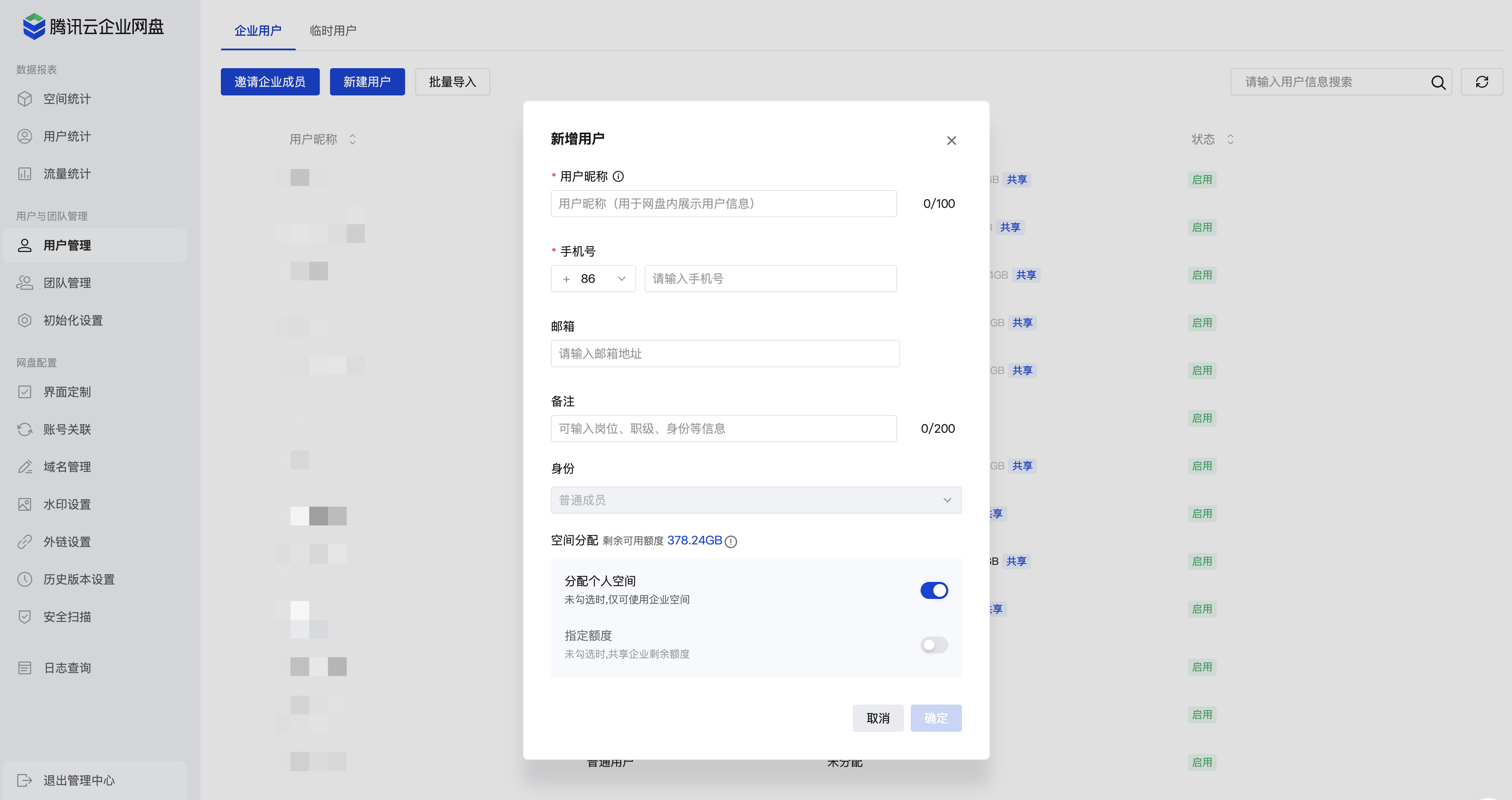 空间分配:可选择是否分配给该用户个人空间,若选择分配,则该用户可使用被分配额度的空间用于存储数据,个人空间数据仅用户本人可查看。