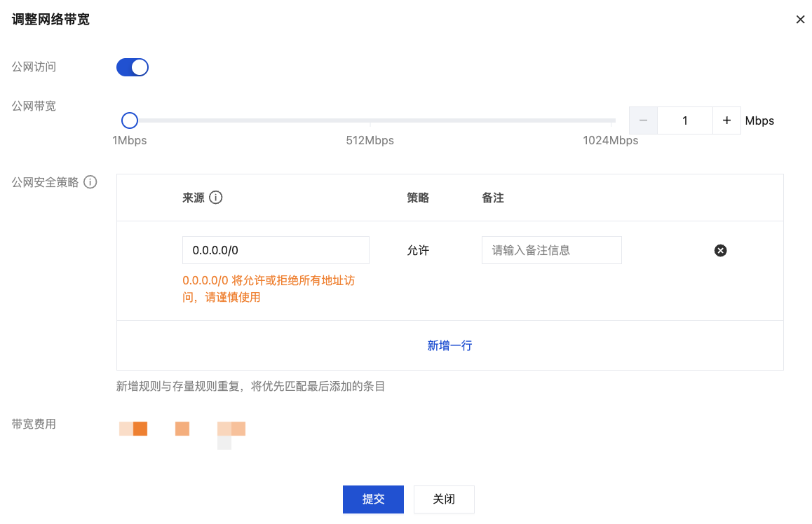 3. 在调整网络带宽的弹窗中,设置好公网带宽大小,并为公网设置好安全访问策略,允许您指定的 IP 访问。不设置安全策略默认禁止所有 IP 访问。