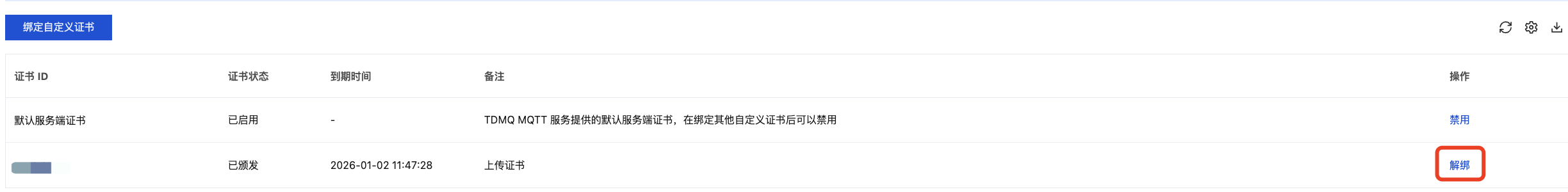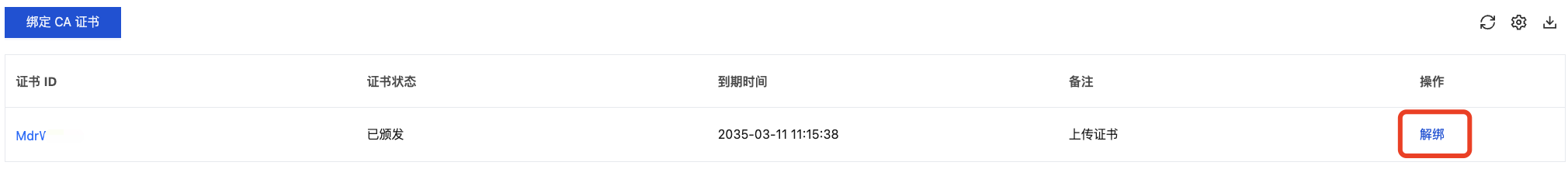 若您不再需要配置的 CA 证书,可以将其解绑。解绑后,将无法通过证书进行连接。