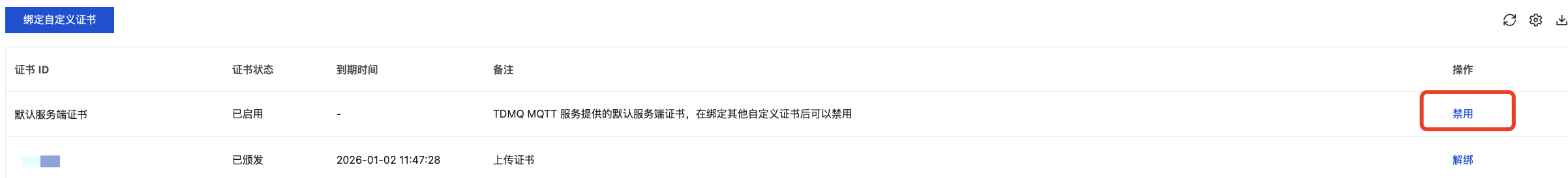 在绑定其他自定义证书后,可以禁用 TDMQ MQTT 版提供的默认服务端证书,具体步骤如下: