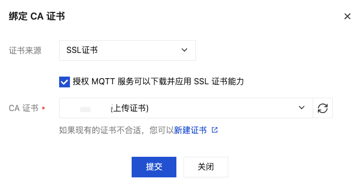 证书来源:选择 SSL 证书。需授权 MQTT 服务可以下载并应用 SSL 证书能力。