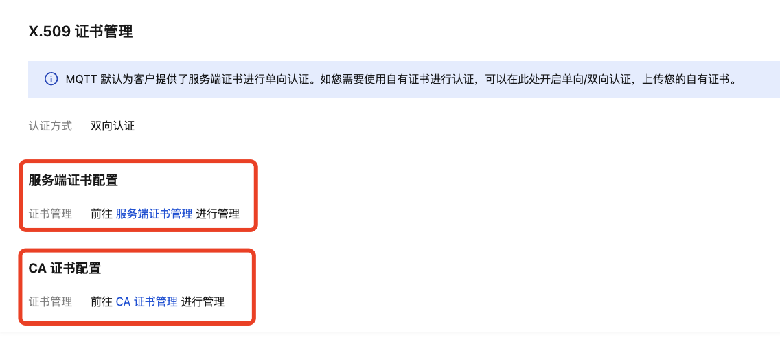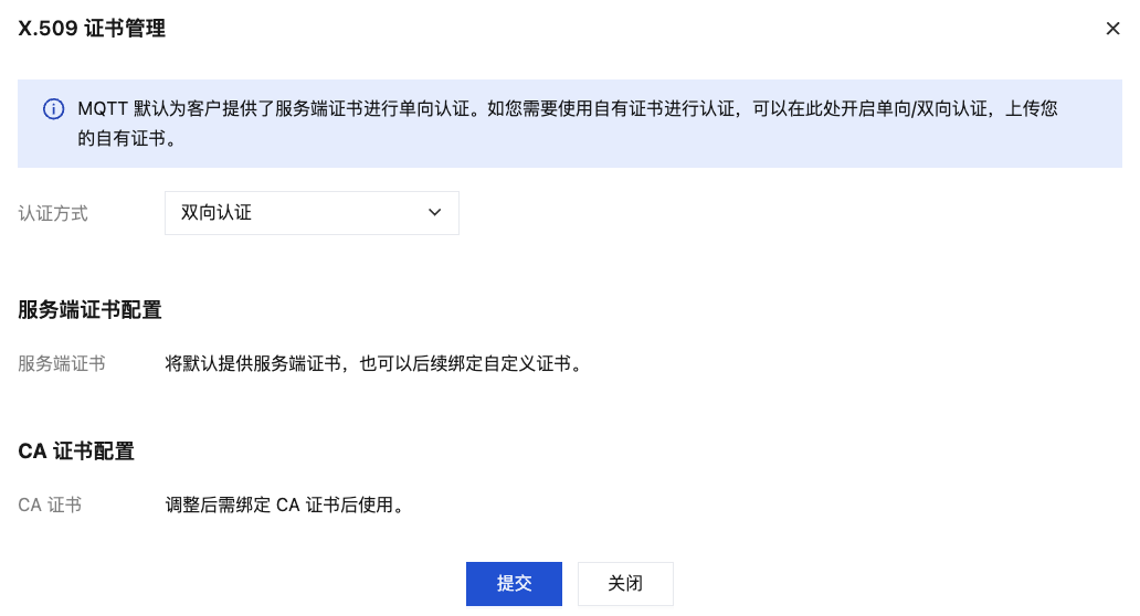 服务端证书:用于客户端对服务端的认证,可以使用 MQTT 提供的默认服务端证书,也可以绑定自定义证书。