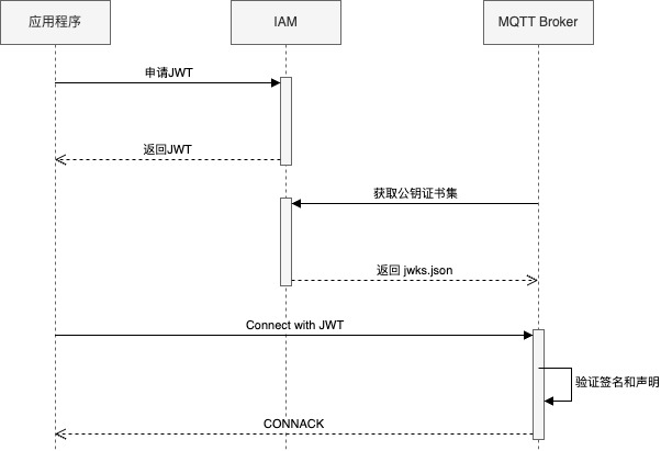 整体的认证原理如下图所示:应用程序从身份识别和访问管理服务(简称 IAM)获取 JWT,客户端在连接请求中携带 JWT,MQTT Broker 将使用预先配置的签名方式(下图的示例为公钥证书集的方式,也可以使用其他签名方式)对收到的 JWT 进行验证,如果内容一致,说明在传输过程中 Token 没有被篡改,认证成功;反之认证失败。
