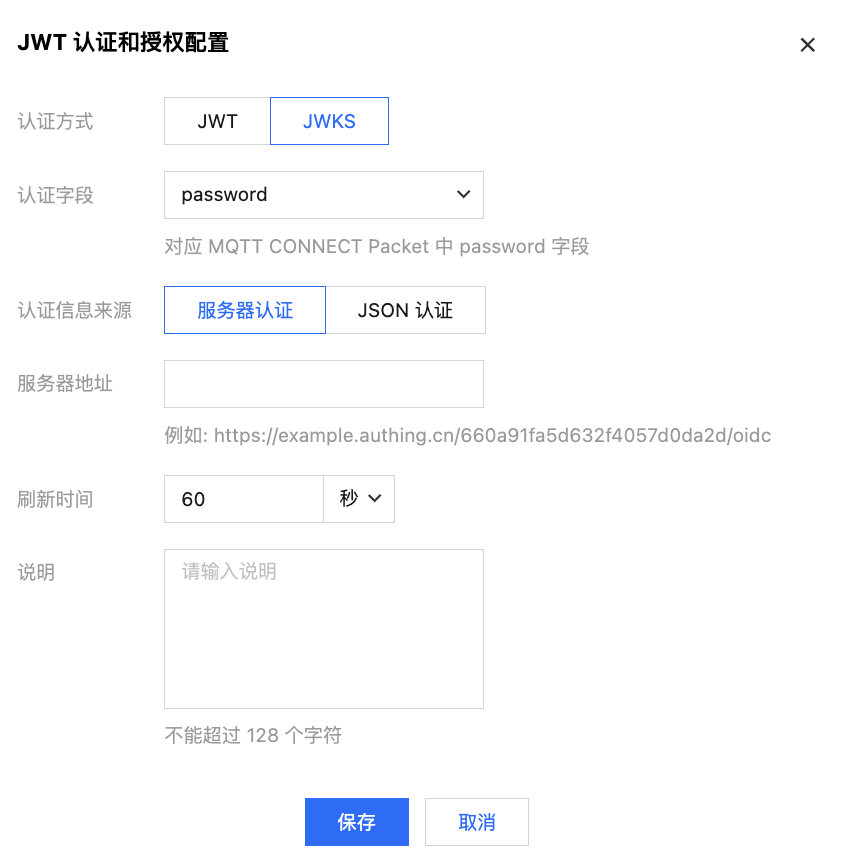 服务器地址:IAM 服务提供 JWKS 端点地址。端点应符合 OIDC 规范,不需要包含/.well-known/jwks.json 部分。请参见您的 IAM 服务提供方文档或者 Auth0 指引。 刷新时间:MQTT Broker 从 IAM 服务刷新公钥集的间隔。默认值为60s。