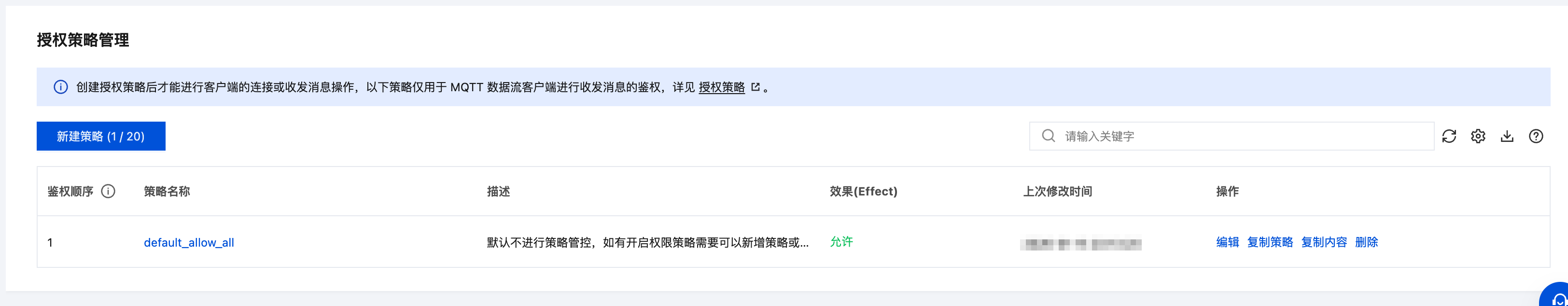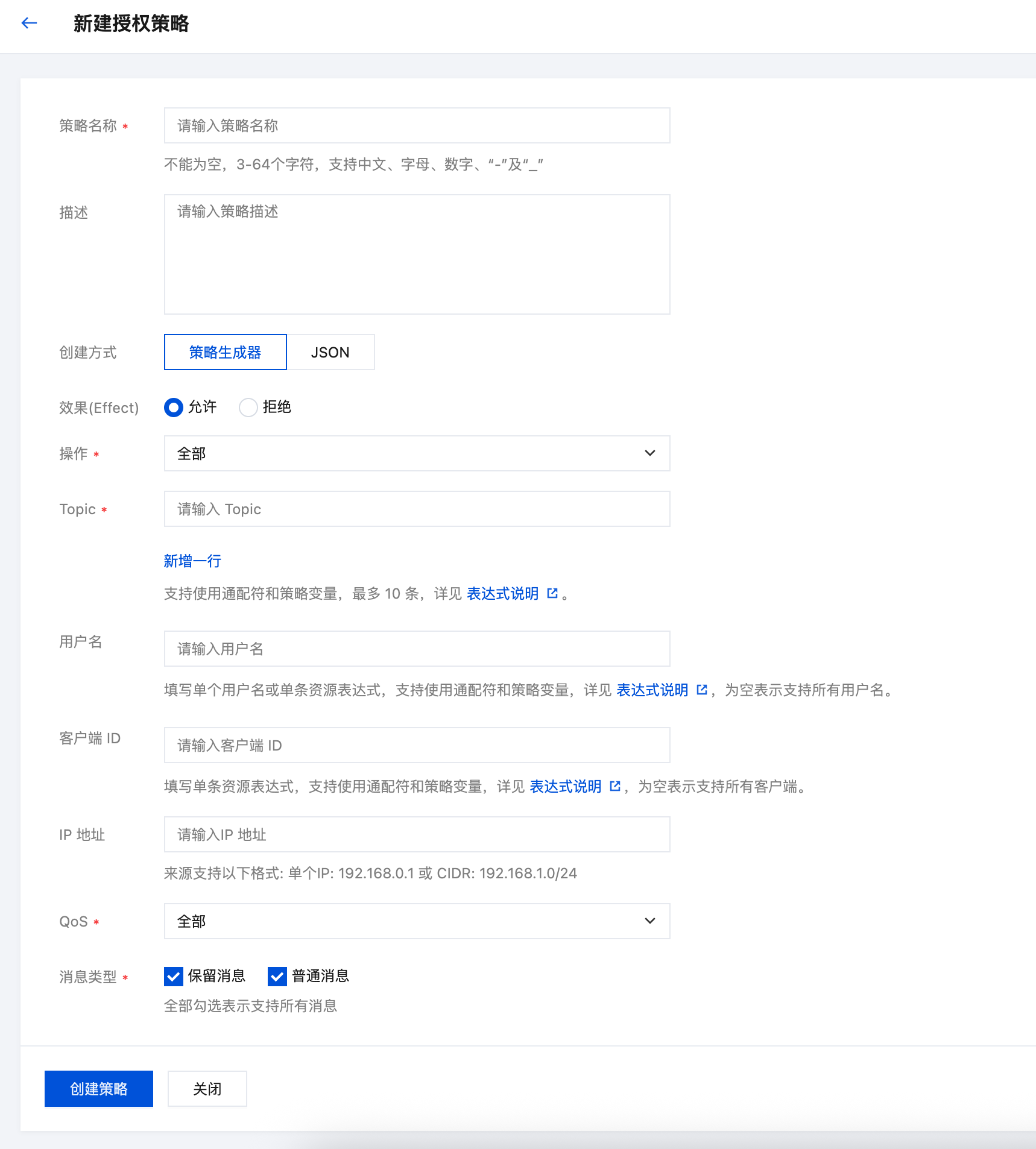 消息类型 | 选择授权策略支持的消息类型:保留消息(retain message)和普通消息,全部勾选表示支持所有消息。 |
