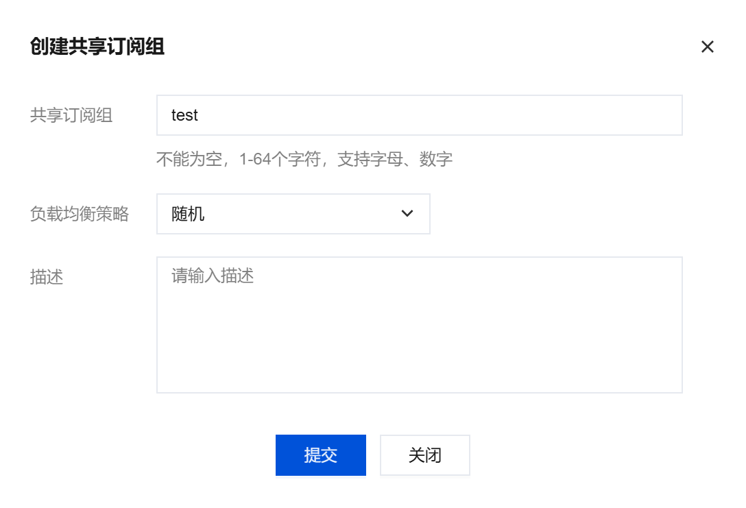 描述 | 填写共享订阅组的说明信息,选填 | 订单处理多客户端负载 |
