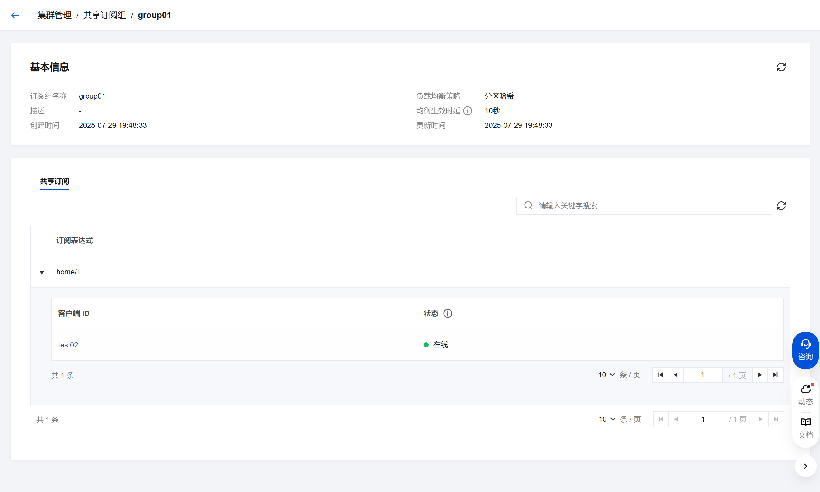 $share/{ShareName}/{topicfilter}进行共享订阅,则 ShareName 会自动出现在共享订阅组的列表,默认的负载均衡策略为随机策略。