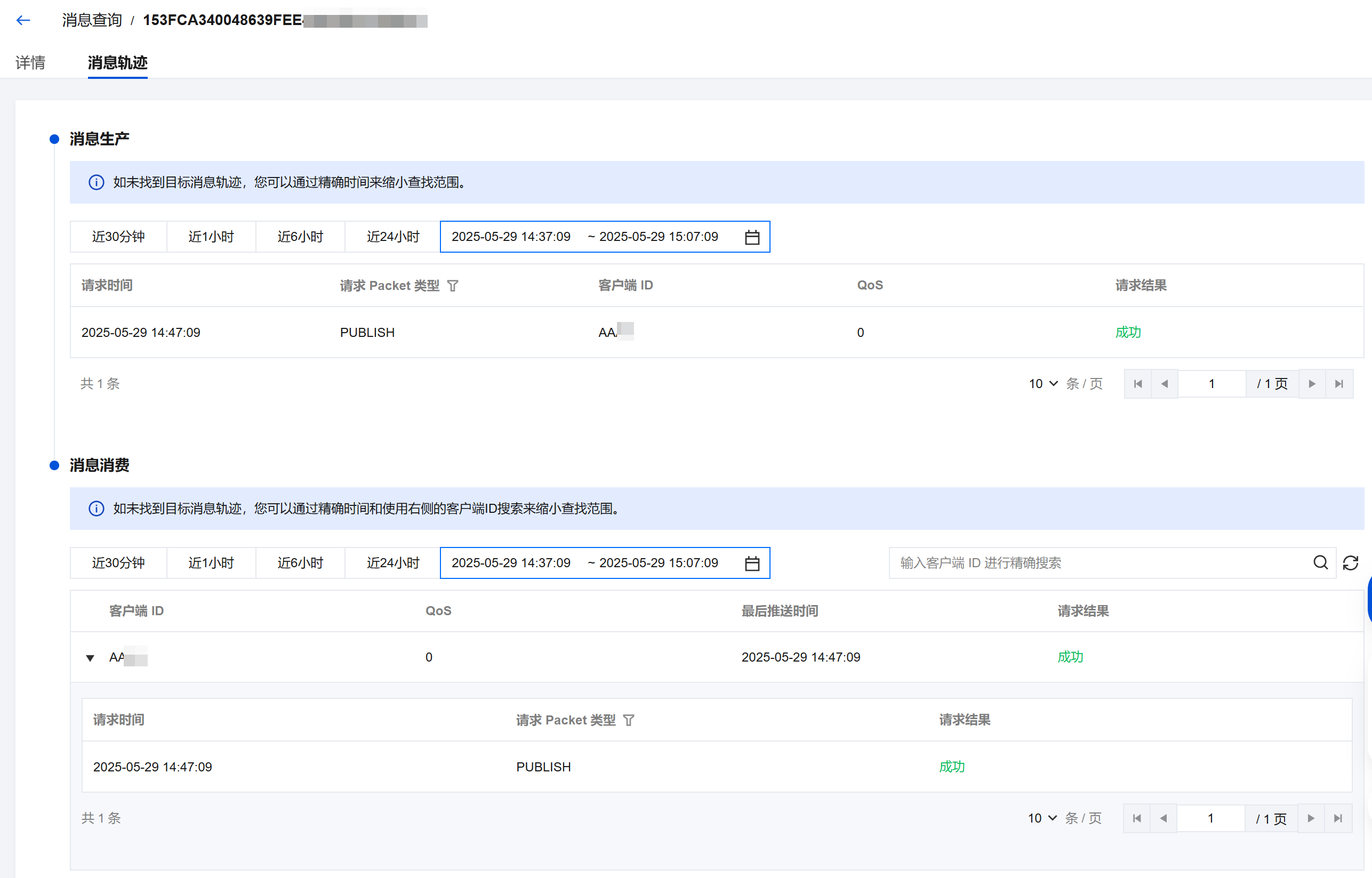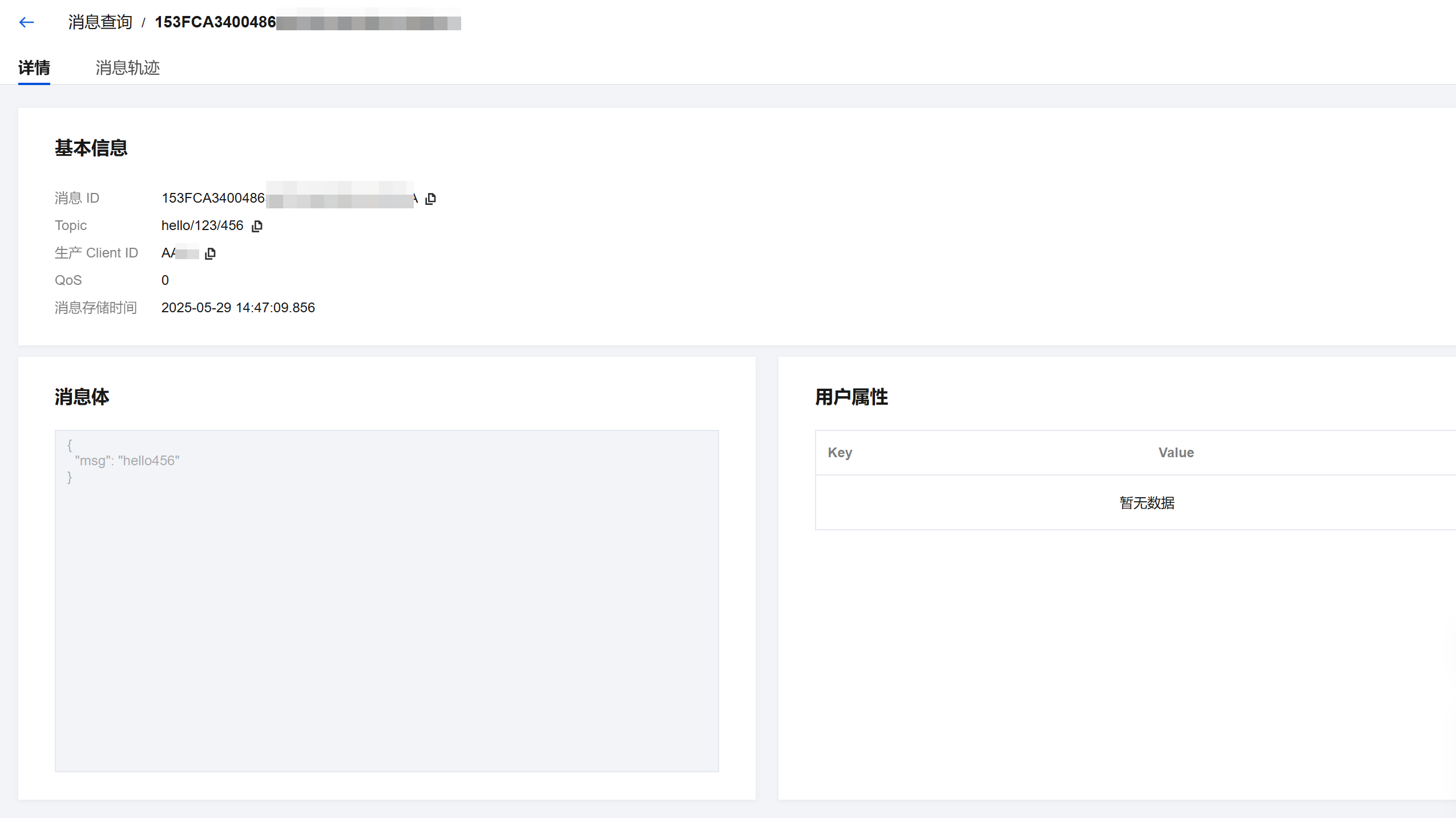 5. 详情页单击 Tab 栏的消息轨迹,即可查看该消息的消息轨迹。