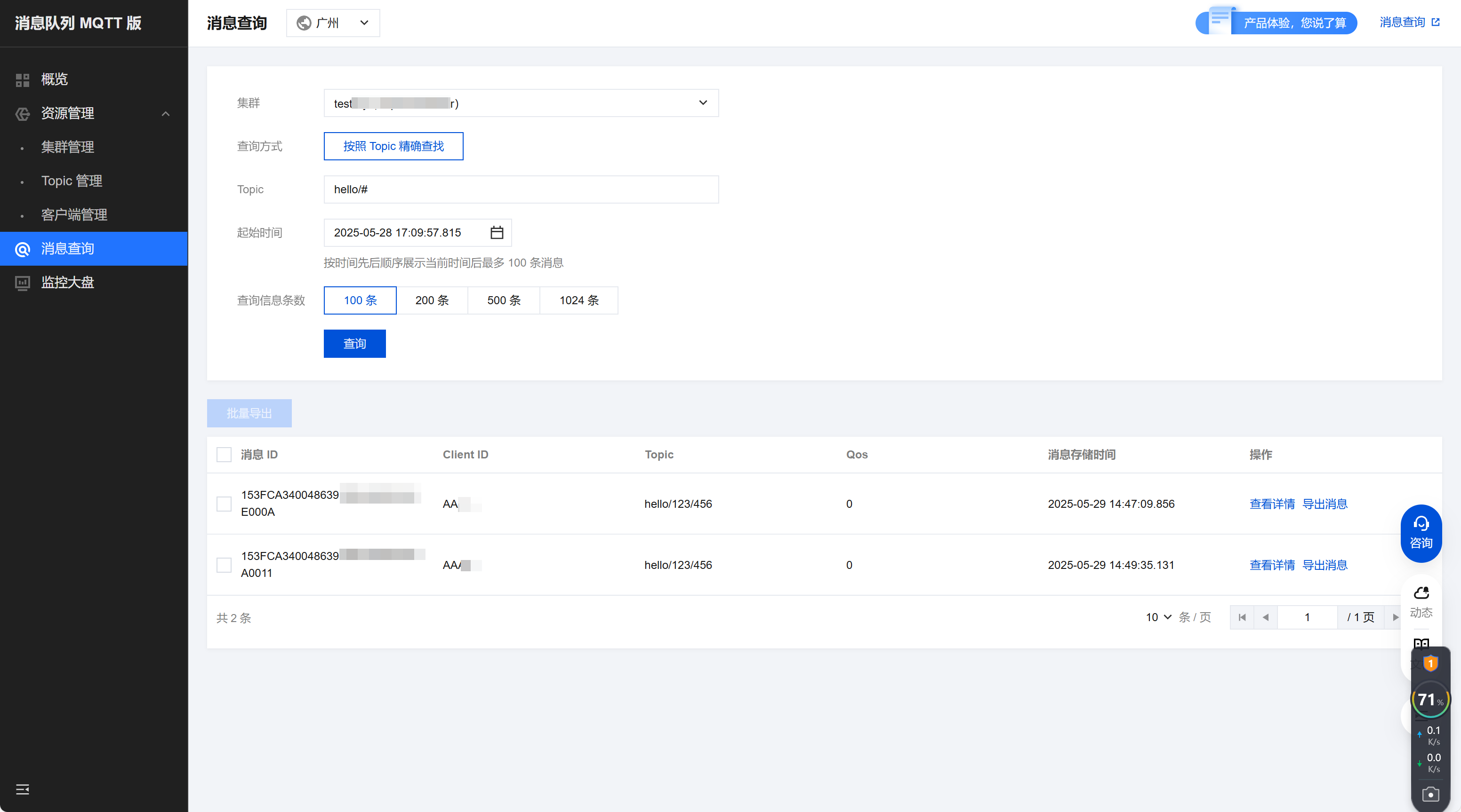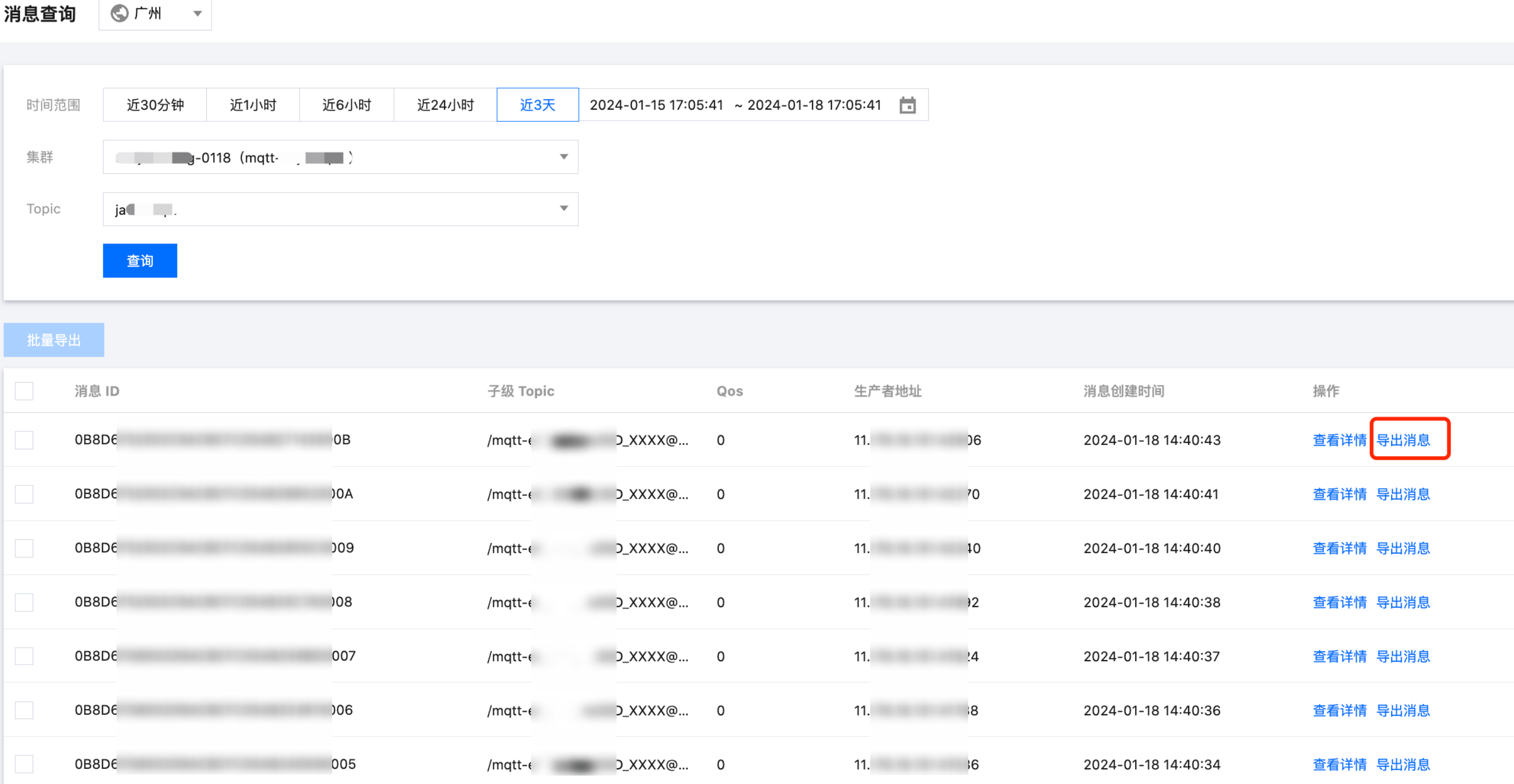在查询到某条消息后,您可以单击操作列的导出消息将该条消息的 ID、子级 Topic、Qos、时间属性等信息导出。同时,您可以批量选择当前页面内的消息,批量导出多条消息。将消息导出到本地后,用户可以根据需要对消息进行一些处理,如复制消息体或者进行时间排序等操作。