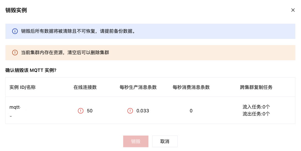 当前集群内存在 Topic 等资源时,不支持销毁,清空集群下所有的资源后才可以销毁。