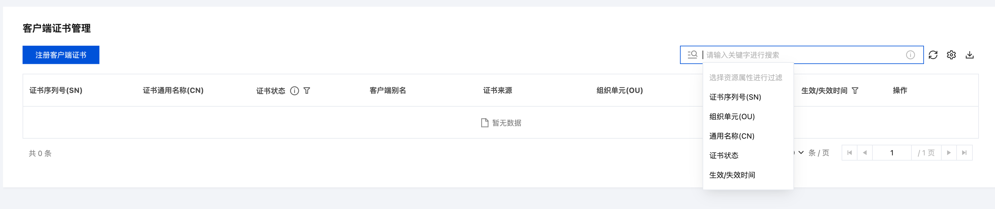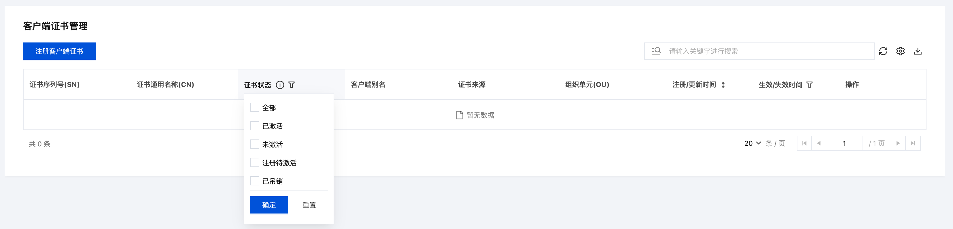 筛选生效/失效时间 | 单击生效/失效时间旁的 ![]() | 筛选出已失效和即将失效(30天内即将过期)的客户端证书。 |