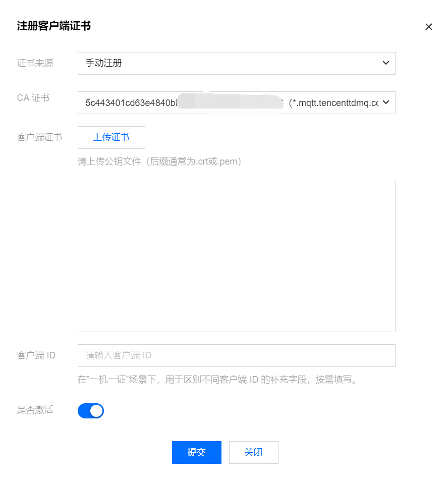取消激活证书 | 单击操作栏的取消激活证书 | 证书取消激活后,使用当前证书的客户端在连接时会被拒绝,因此在进行证书的状态流转时需要特别注意对于客户端连接的影响。 |