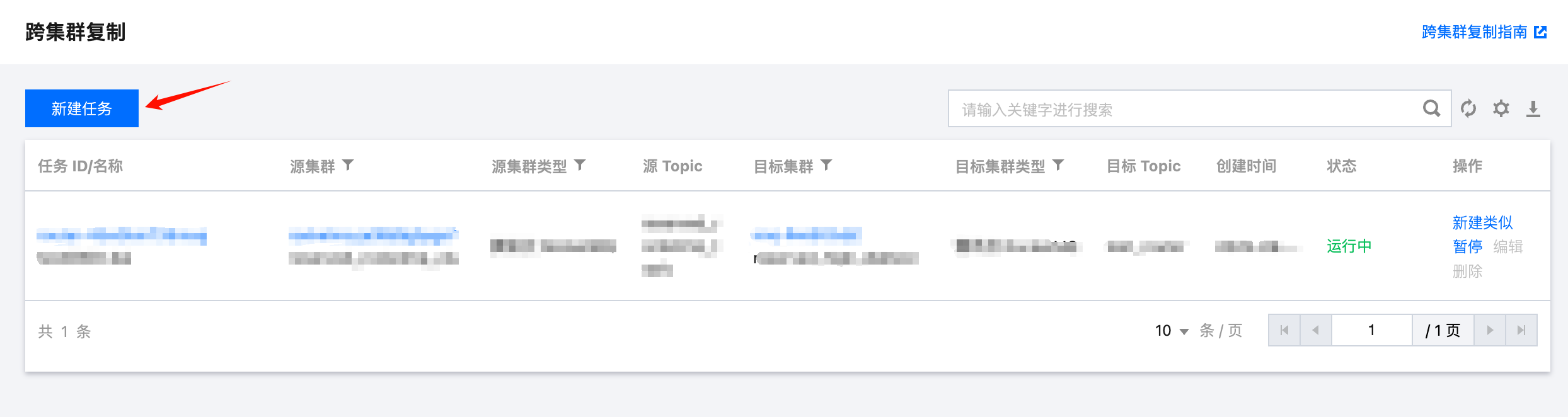 1. 在任务创建完成后,您可以在任务的列表页看到新增的复制任务,同时可以快速查看任务的状态。单击操作列的启动/暂停可以快速的开启和暂停任务。