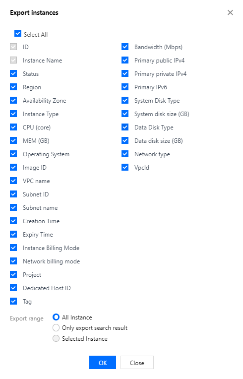您可以在控制台中导出某地域的云服务器实例列表,并且可自定义导出列表的字段。自定义导出字段最多勾选27个字段,当前支持导出的字段包括:ID、实例名、状态、地域、可用区、实例类型、操作系统、镜像 ID、CPU、内存、带宽、公网 IP、内网 IP、系统盘类型、系统盘大小、数据盘类型、数据盘大小、所属网络、所在子网、关联 VPC、创建时间、到期时间、实例计费模式、网络计费模式、所属项目、专用宿主机 ID 和标签。