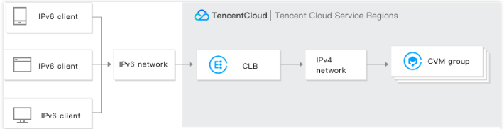 IPv6 NAT64 负载均衡绑定的安全组支持 IPv4 地址,暂不支持 IPv6 地址;IPv6 NAT64 CLB 支持 IPv6 客户端和 IPv4 客户端的访问,如有 IPv4 客户端访问的需求请 提交工单 获取 IPv4 VIP。 互联网 IPv6 网络大环境还处于建设初期,不提供 SLA 保障,如出现线路访问不通的情况,请 提交工单 反馈。 负载均衡支持创建 IPv6 NAT64 负载均衡实例,腾讯云会给实例分配一个 IPv6 公网地址(即 IPv6 版的 VIP),该 VIP 会将来自 IPv6 客户端的请求转发给后端的 IPv4 云服务器。