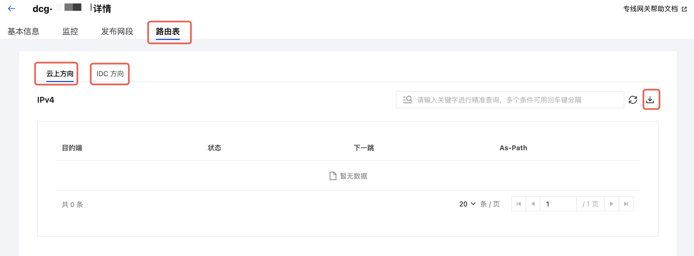 页签,查看专线网关云上方向和 IDC 方向的路由表,若需下载路由表信息,请单击