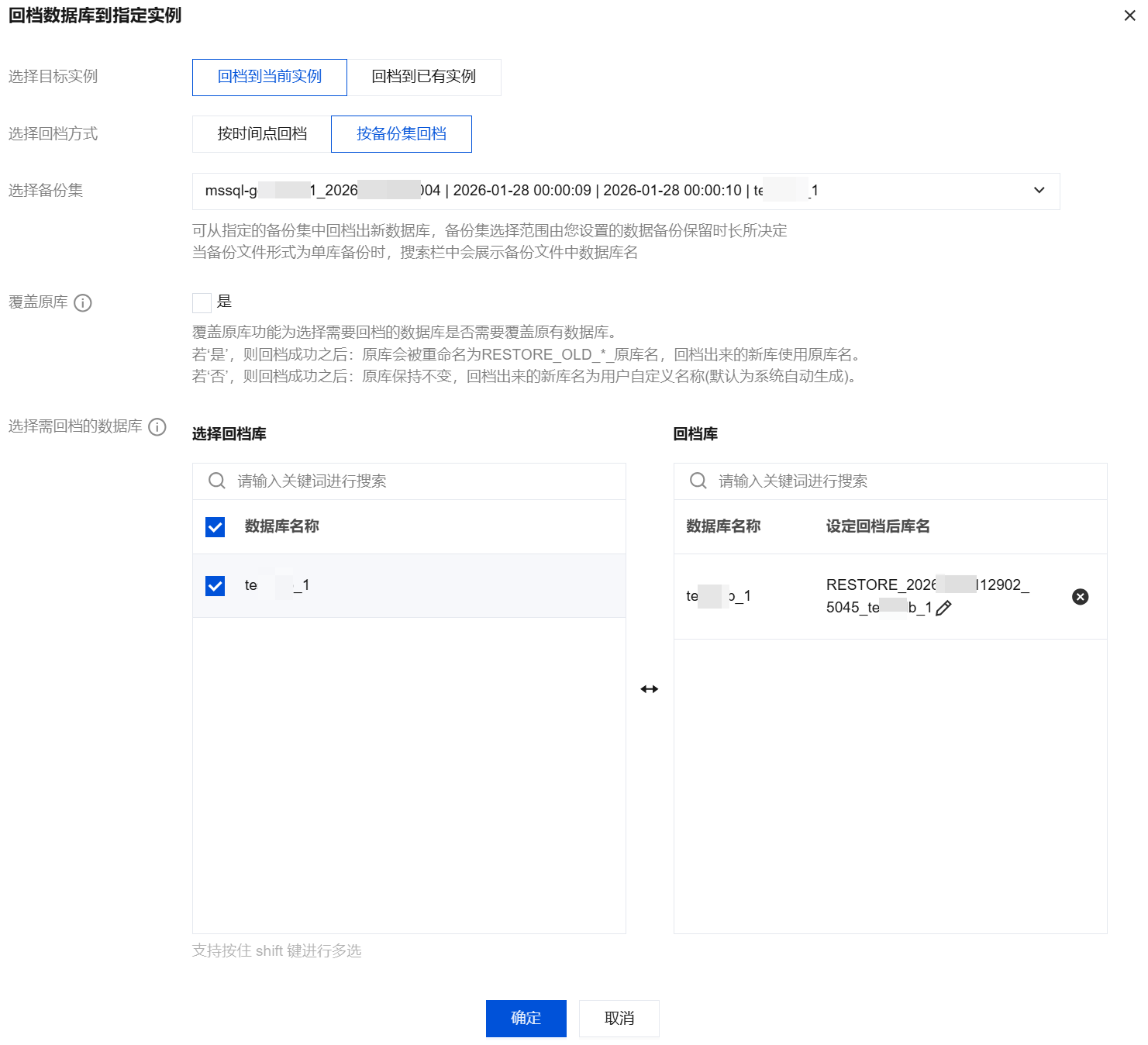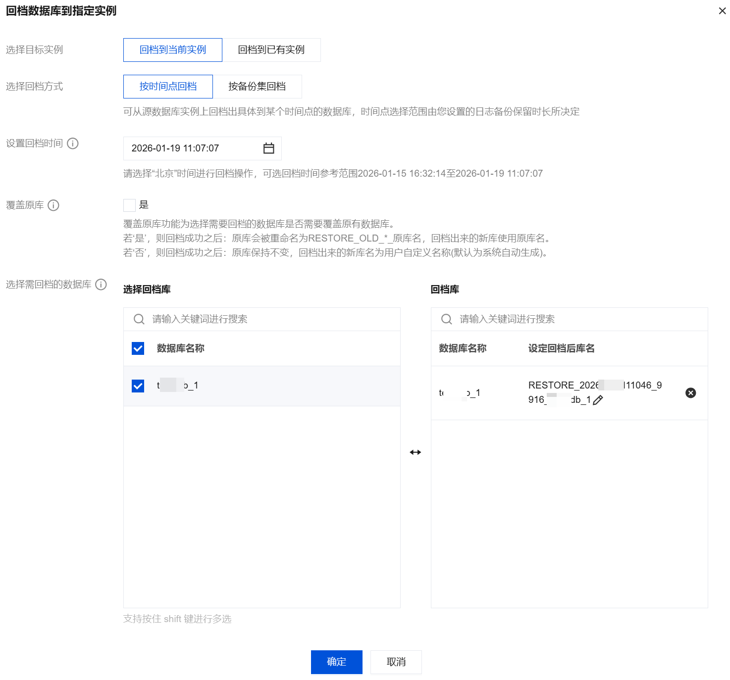 覆盖原库 | 选择需要回档的数据库是否需要覆盖原有数据库。 勾选“是”,则回档成功之后:原库会被重命名为 RESTORE_OLD_*_原库名,回档出来的新库使用原库名。 不勾选“是”,则回档成功之后:原库保持不变,回档出来的新库名为用户自定义名称(默认为系统自动生成)。 |