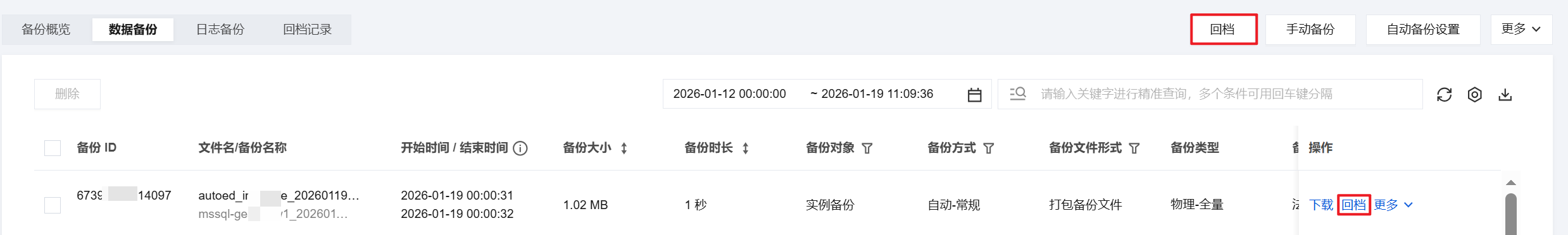 选择备份集 | 选择回档的备份集。 可从指定的备份集中回档出新数据库,备份集选择范围由您设置的数据备份保留时长决定。 当备份文件形式为单库备份时,搜索栏中会展示备份文件中的数据库名。 |