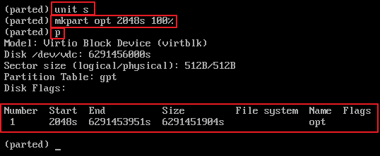unit s 并按 Enter,设置磁盘的计量单位为磁柱。mkpart opt 2048s 100%,按 Enter。