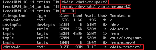 /data/newpart2 为例:mount /dev/vdc1 /data/newpart2
