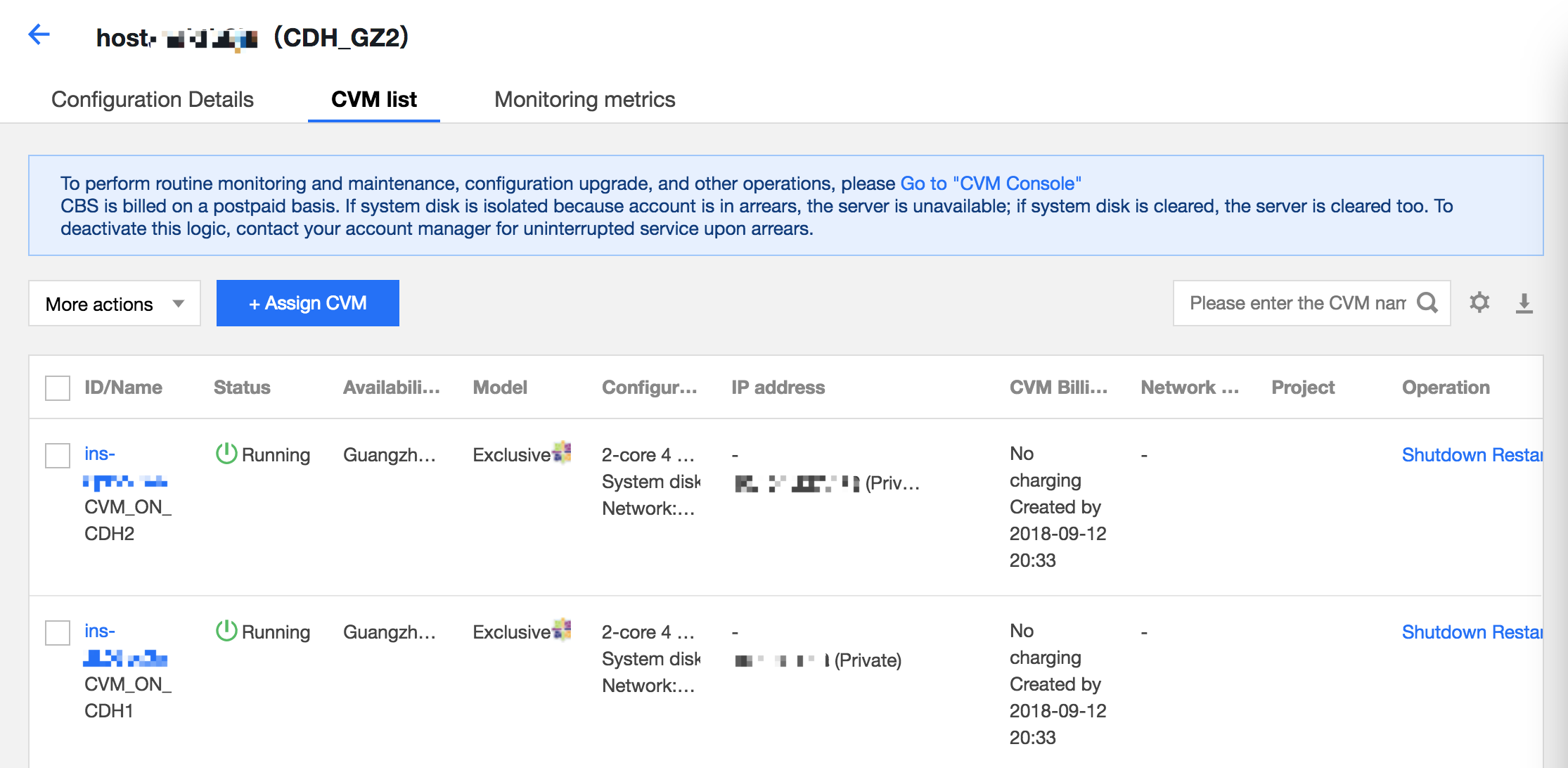 单击专用宿主机的 ID,进入专用宿主机详情页,可以查看专用宿主机的详细信息以及该宿主机上的子机信息。如下图所示: