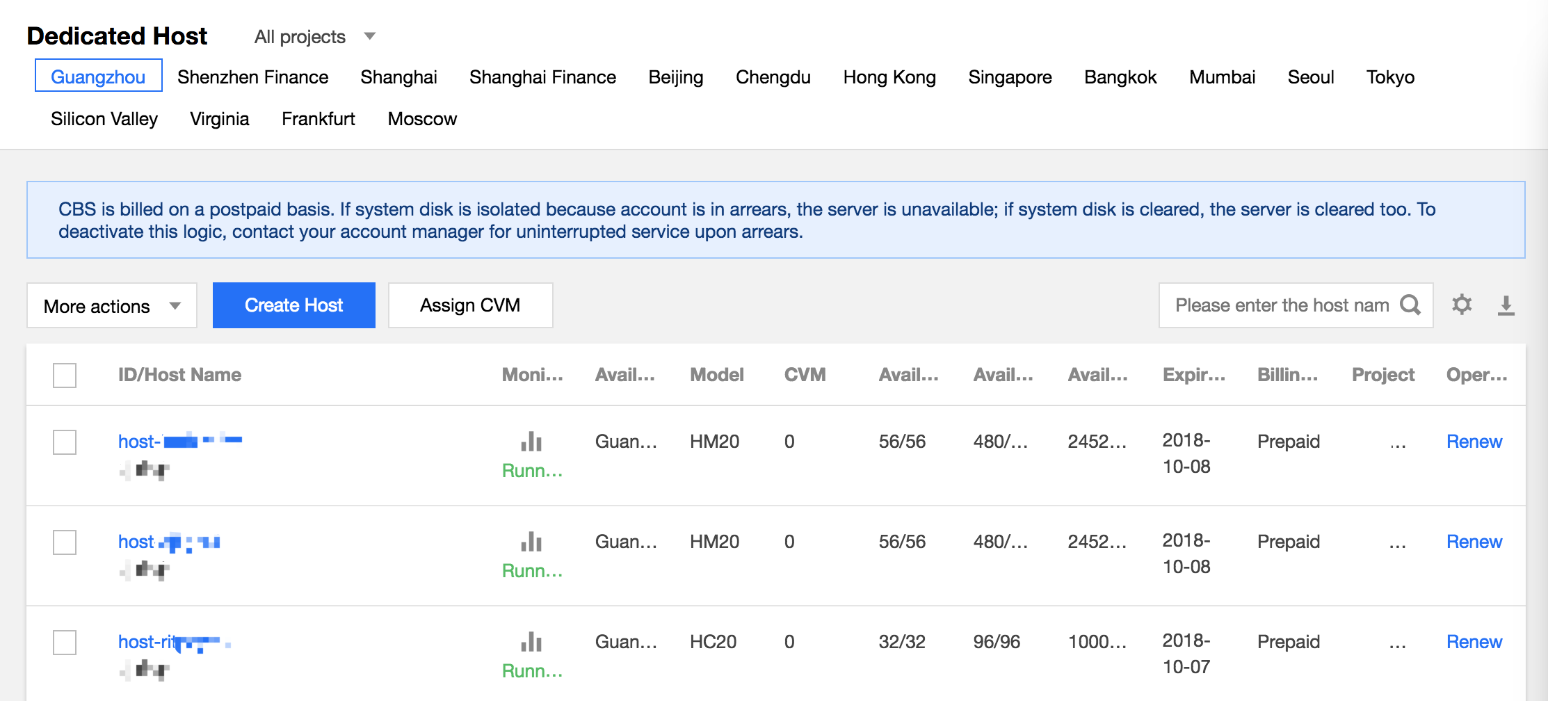 界面顶部选择相应的地域,您就可以查看到您在当前地域所拥有的专用宿主机的信息,包括可用区、机型、总资源和剩余可用资源的情况、到期时间等。如下图所示: