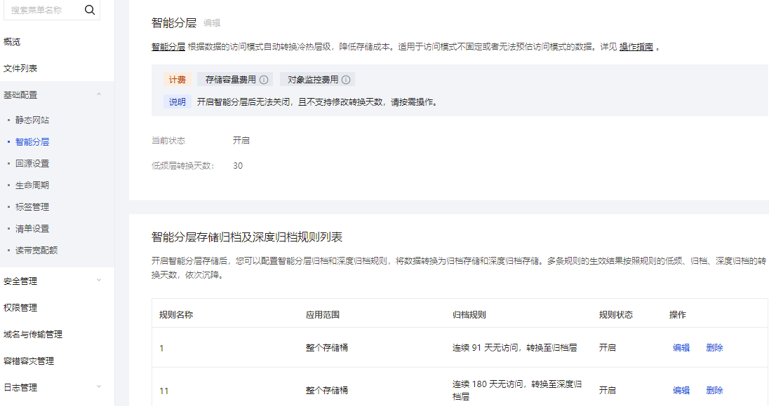 9. 当需要停止智能分层归档及深度归档规则时,单击编辑 ,将对应规则的状态修改为关闭或者直接删除生命周期规则即可。