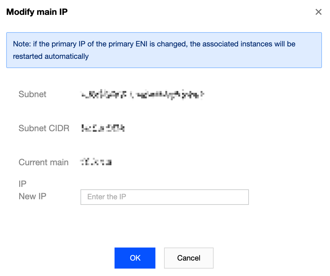 修改主网卡的主内网 IP 会导致关联的实例自动重启约30s,重启过程中会存在短暂的业务中断,重启后业务即可恢复,请您根据实际情况谨慎操作。