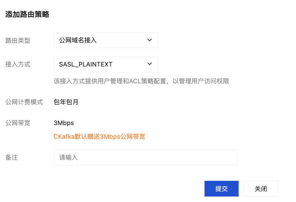 路由类型:公网域名接入, 接入方式:SASL_PLAINTEXT。