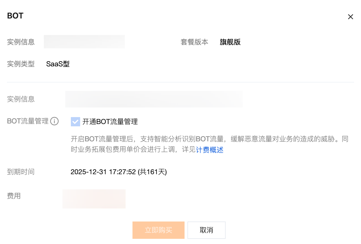BOT:根据需求选择是否开通 BOT 流量管理,单击立即购买,即可购买 BOT 流量管理服务。