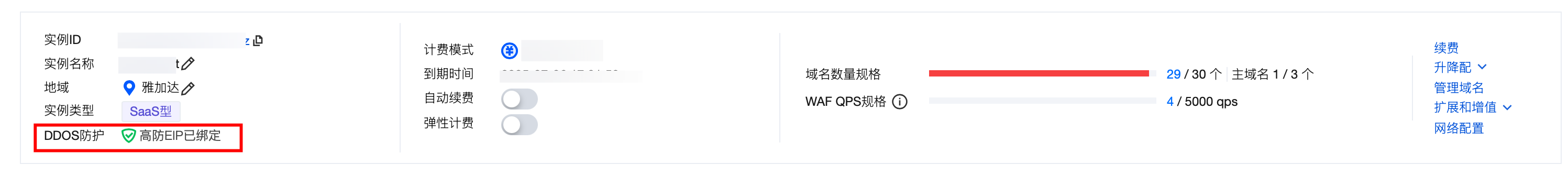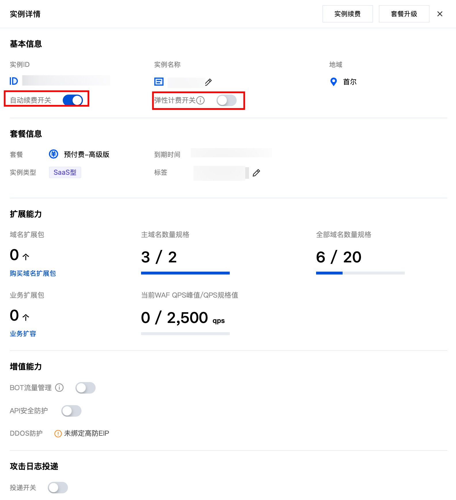 5. 在实例管理页面(以 SaaS 实例为例),可以查看该实例的基本信息、套餐信息、扩展能力、增值能力及攻击日志投递信息。