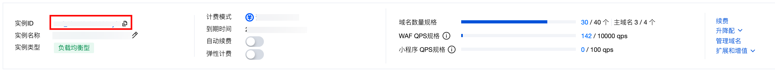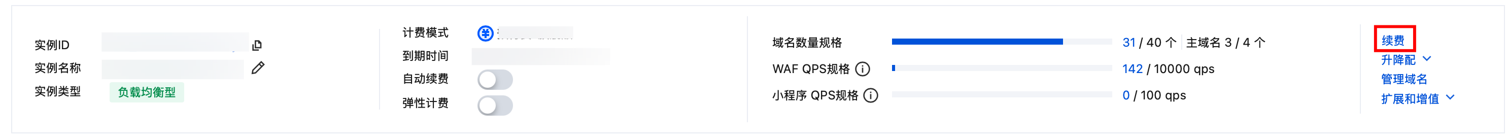 搜索到所需实例并查看后,在 实例管理页面 的展板上可以查看您购买的产品套餐的到期时间和扩展包的使用剩余情况。 1. 若套餐即将到期,需要续费,单击续费,在 Web 应用防火墙套餐续费页面,选择续费时长,单击立即续费,可对当前套餐进行续费。