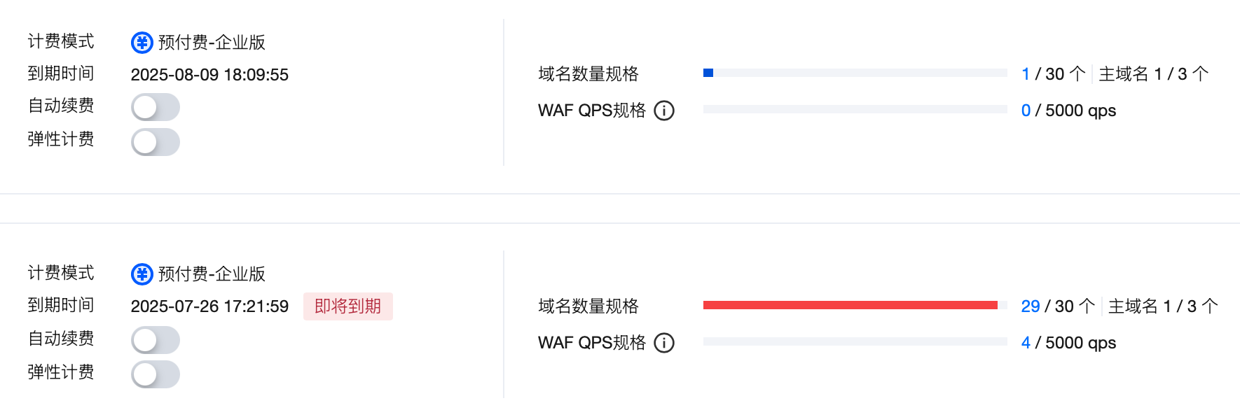 2. 如果展板显示域名数量包或 QPS 规格将满,单击扩展与增值,选择域名扩展包、业务扩展包、小程序扩展包或 BOT、API 安全,即可进行相关服务的购买。