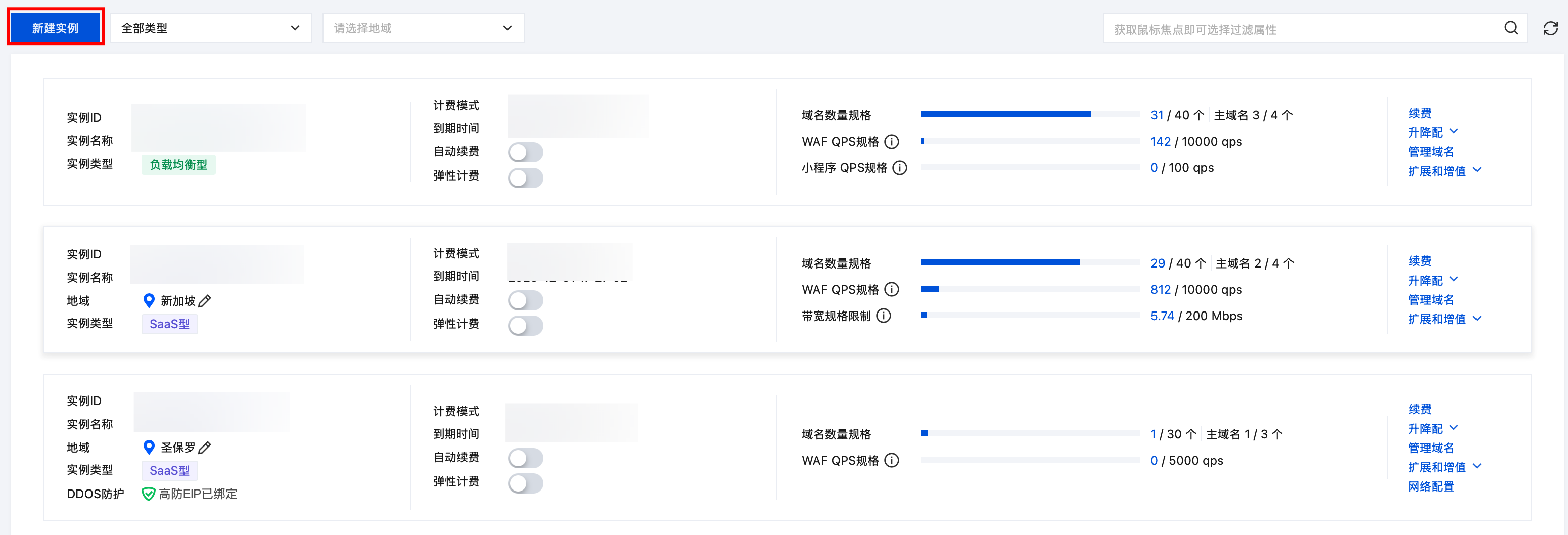 本文档将为您介绍 Web 应用防火墙(WAF)资产中心的实例管理模块,可以查看实例详情和购买新实例,并对实例的套餐和扩展包进行续费和购买管理。
