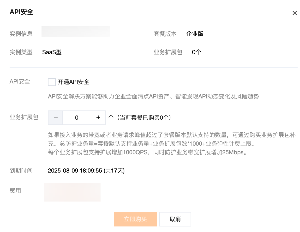 API 安全:根据需求选择是否开通 API 安全及购买业务扩展包,单击立即购买,即可购买相关服务。