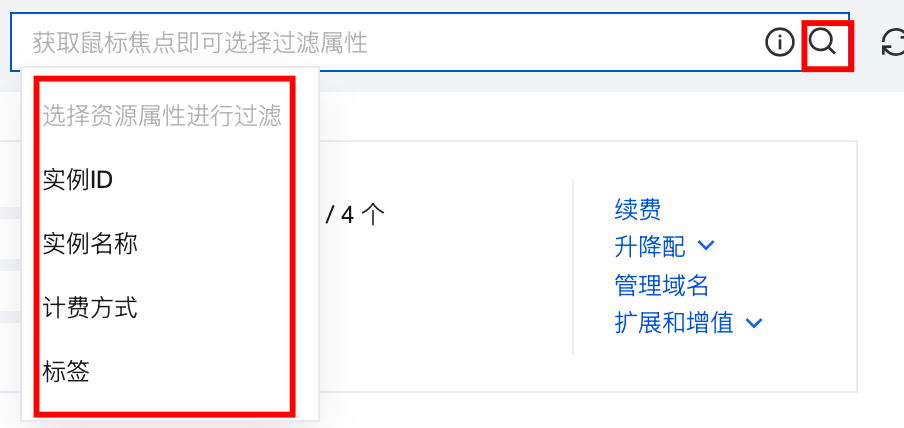单击搜索框,可通过“实例 ID、实例名称和计费方式”关键字对已有实例进行查询。
